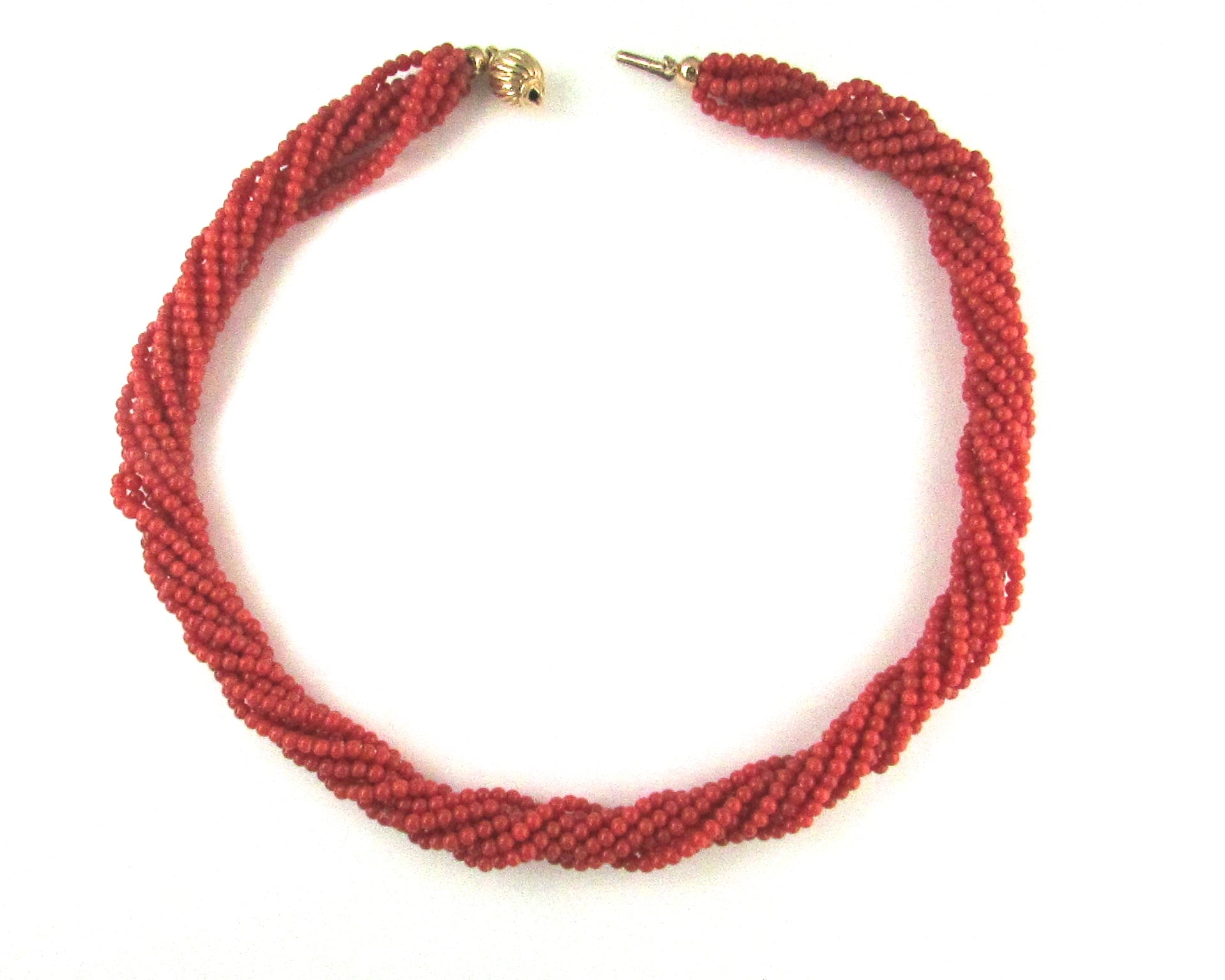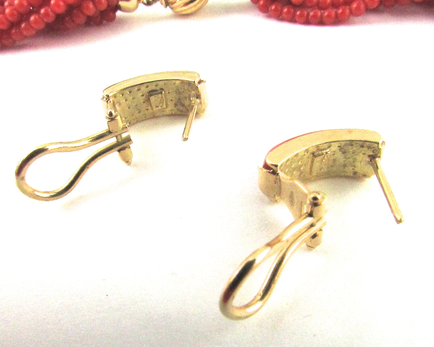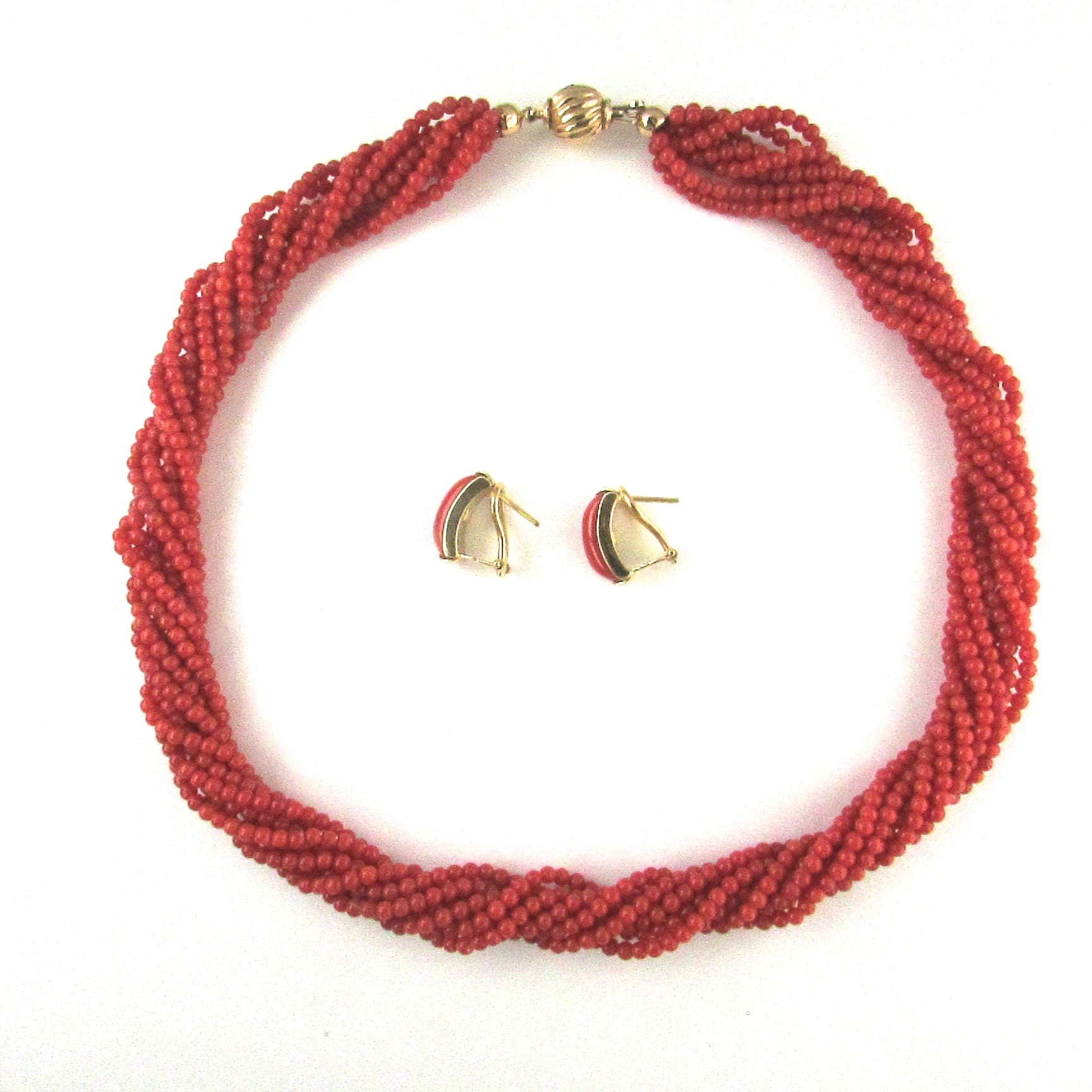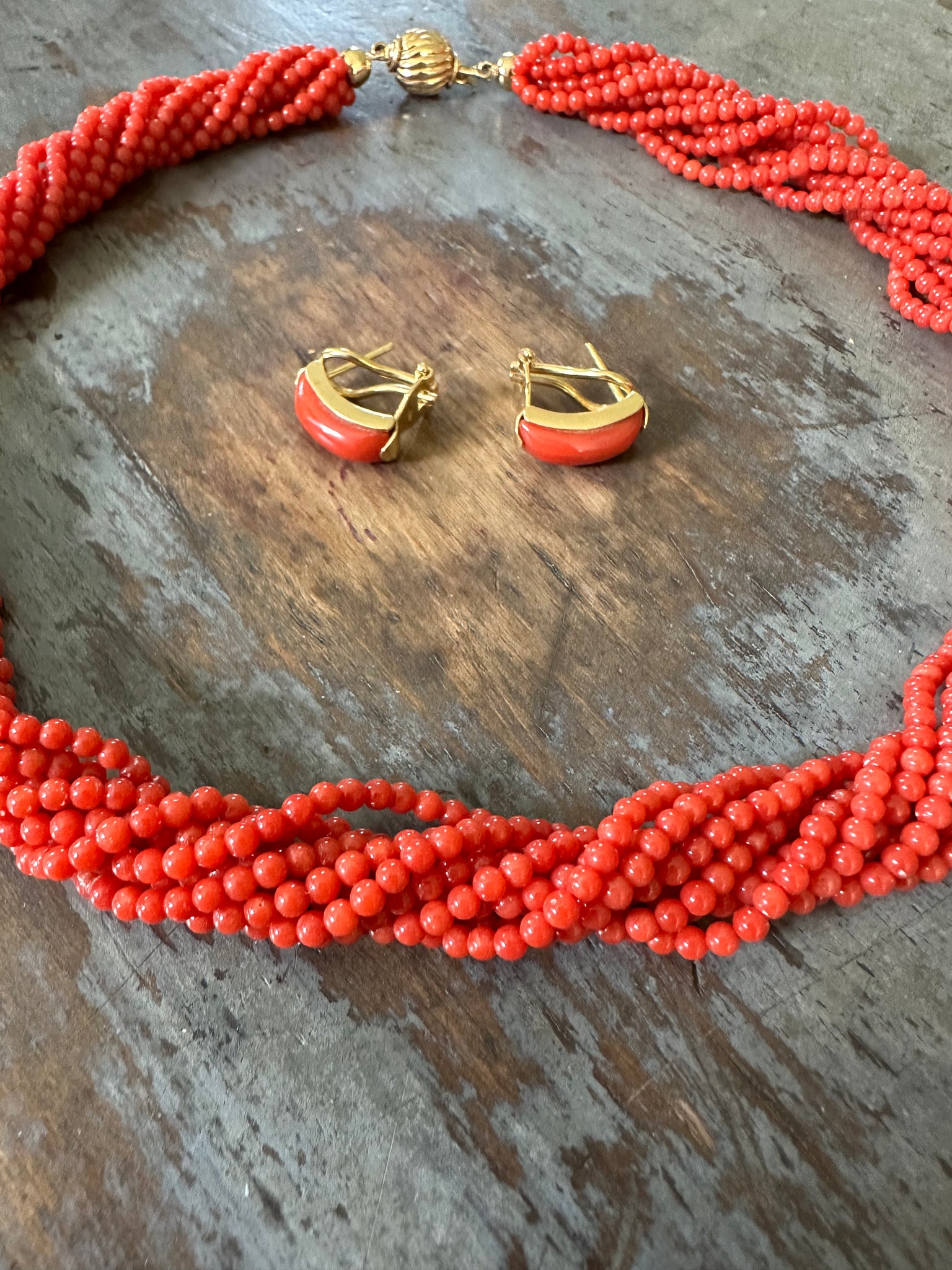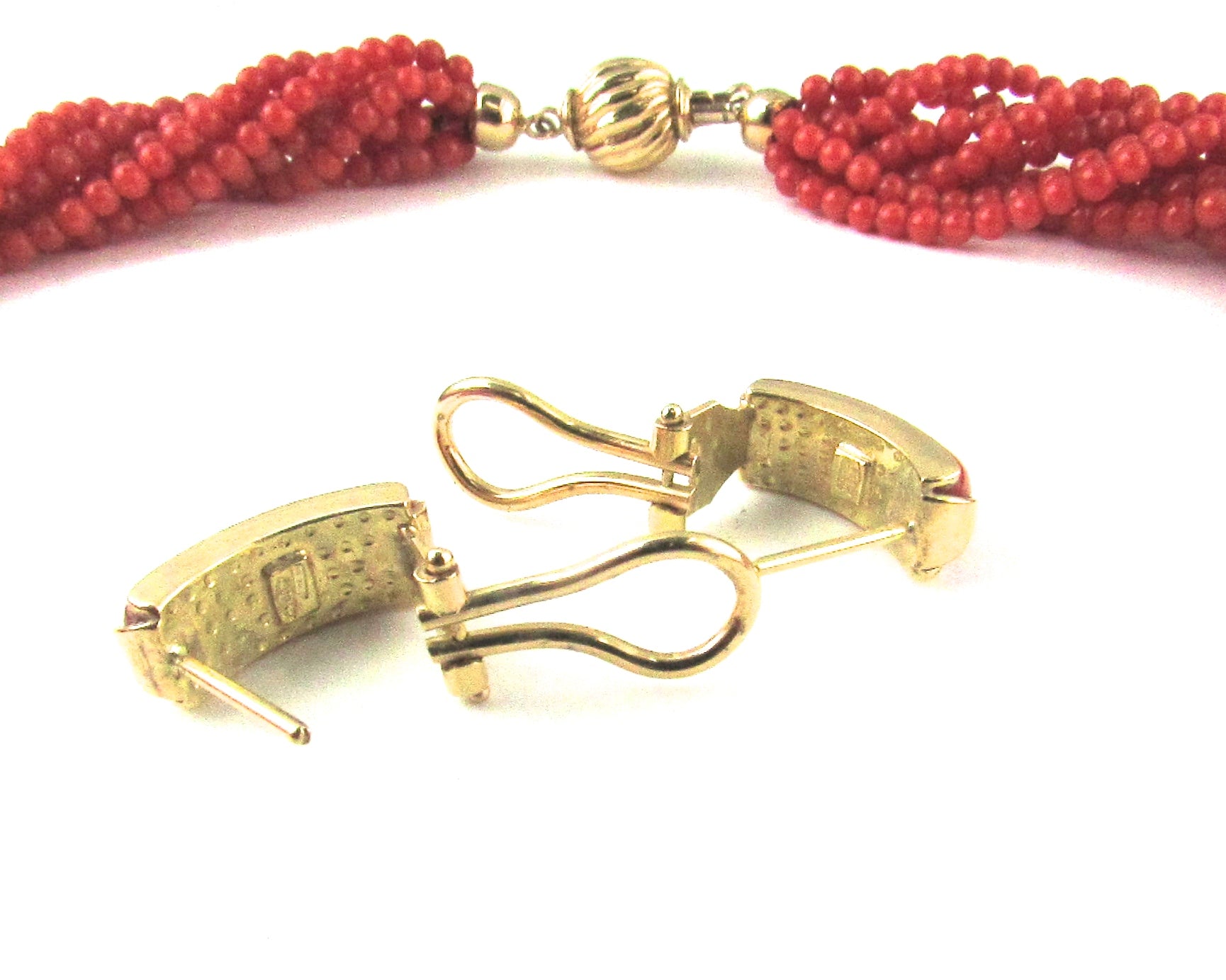 A stunning Demi Parure of 18k yellow gold (750) Italian Mediterranean Coral Torsade multi strand necklace & matching Omega pierced earrings.The necklace is 18.5" overall in length.There are 9 strands of 3 mm beads.The clasp is a lovely 18k of golden swirls. All hallmarked 750 for Italy 18K gold.the earrings are hallmarked as well.all clips and clasp work properly.You can wear the torsade as it is intended by twisting it up or loosely as well!