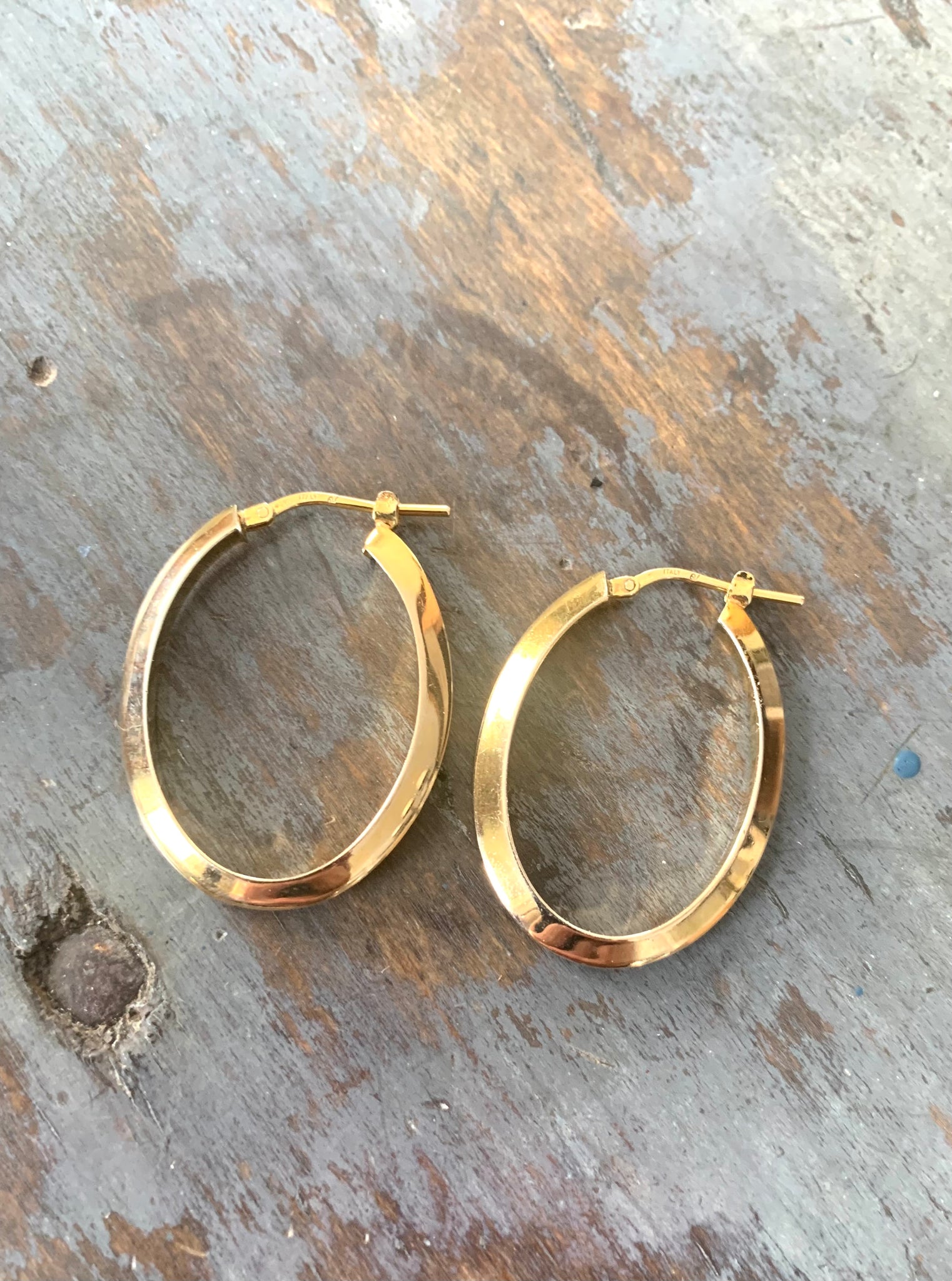 Lovely vintage oval hoops in Vermeil. They are 925 Sterling silver with a gold wash or overlay. They measure 1” across and 1 3/8” long. They are for pierced ears only. They are hallmarked 925 Italy and a makers mark.Last photo is for size comparison. Please see my Instagram account for other photos
