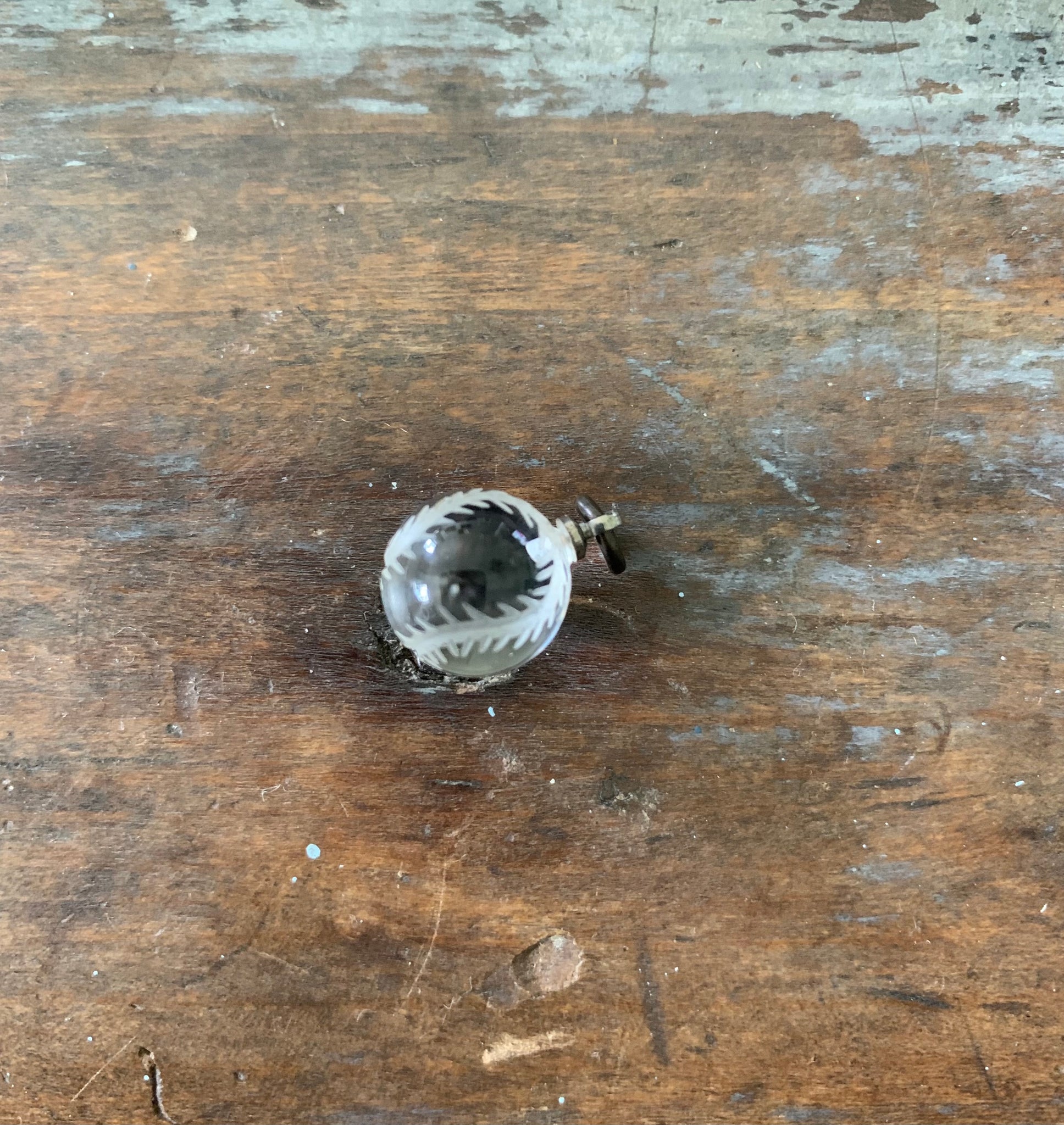 Sweet etched pools of light charm. Rock Crystal etched with a lovely garland pattern.intended to appear as a baseball? Not certain. It measures approximately 12 mm. 3/8” in diameter. It is drilled for the Silver bail only. Love this an addition to any silver charm collection.