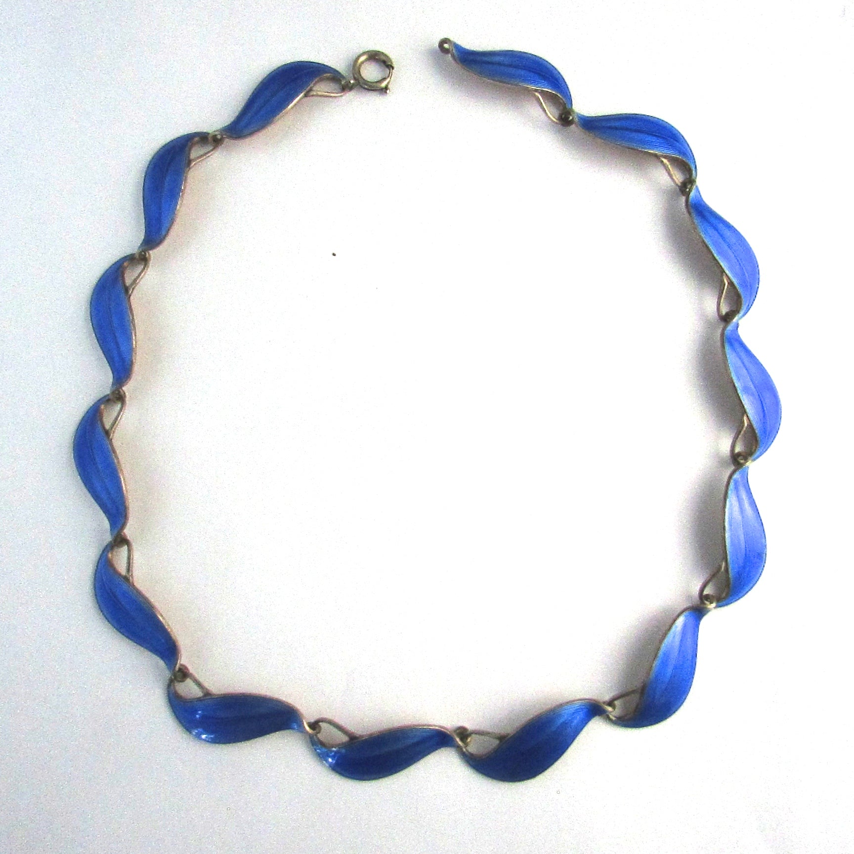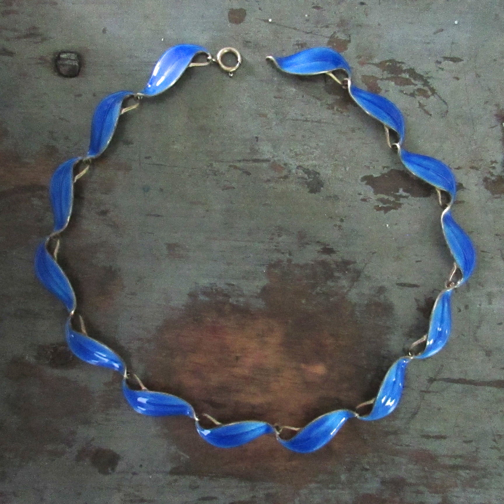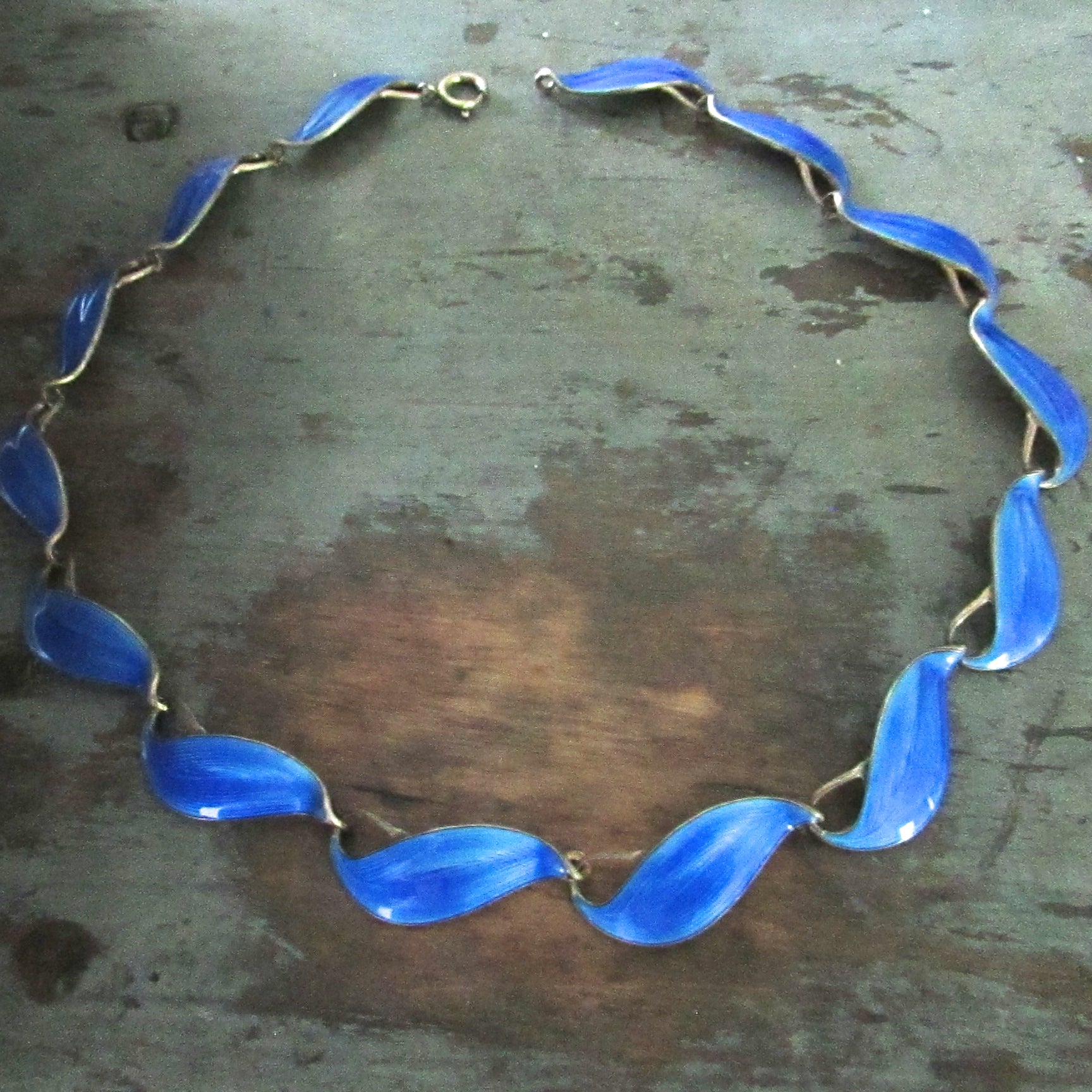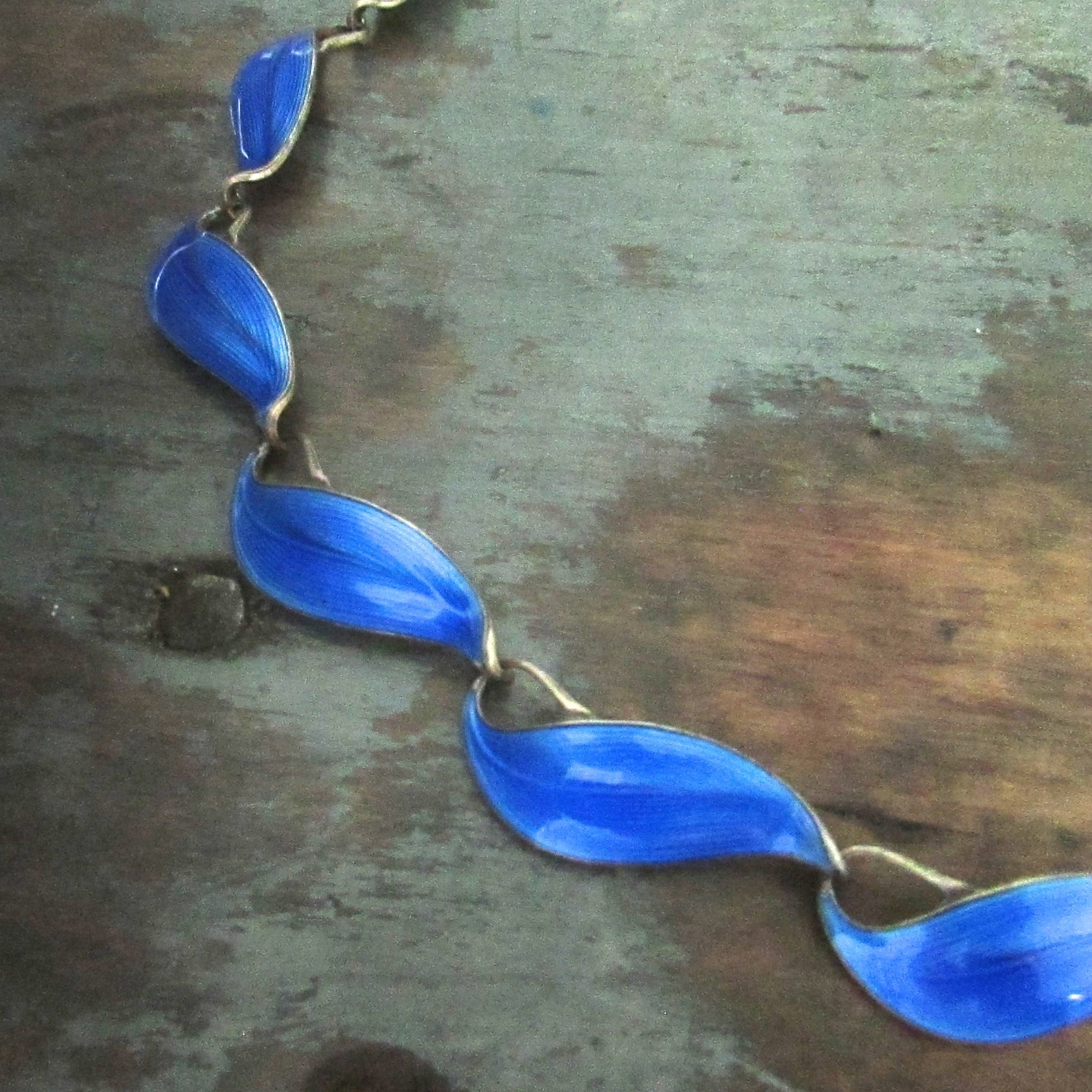 Stunning vintage cobalt blue enamel leaf necklace. Finn Jensen , Norway. I am afraid the photos do not capture the perfection on this piece.I could not avoid reflections no matter what.
