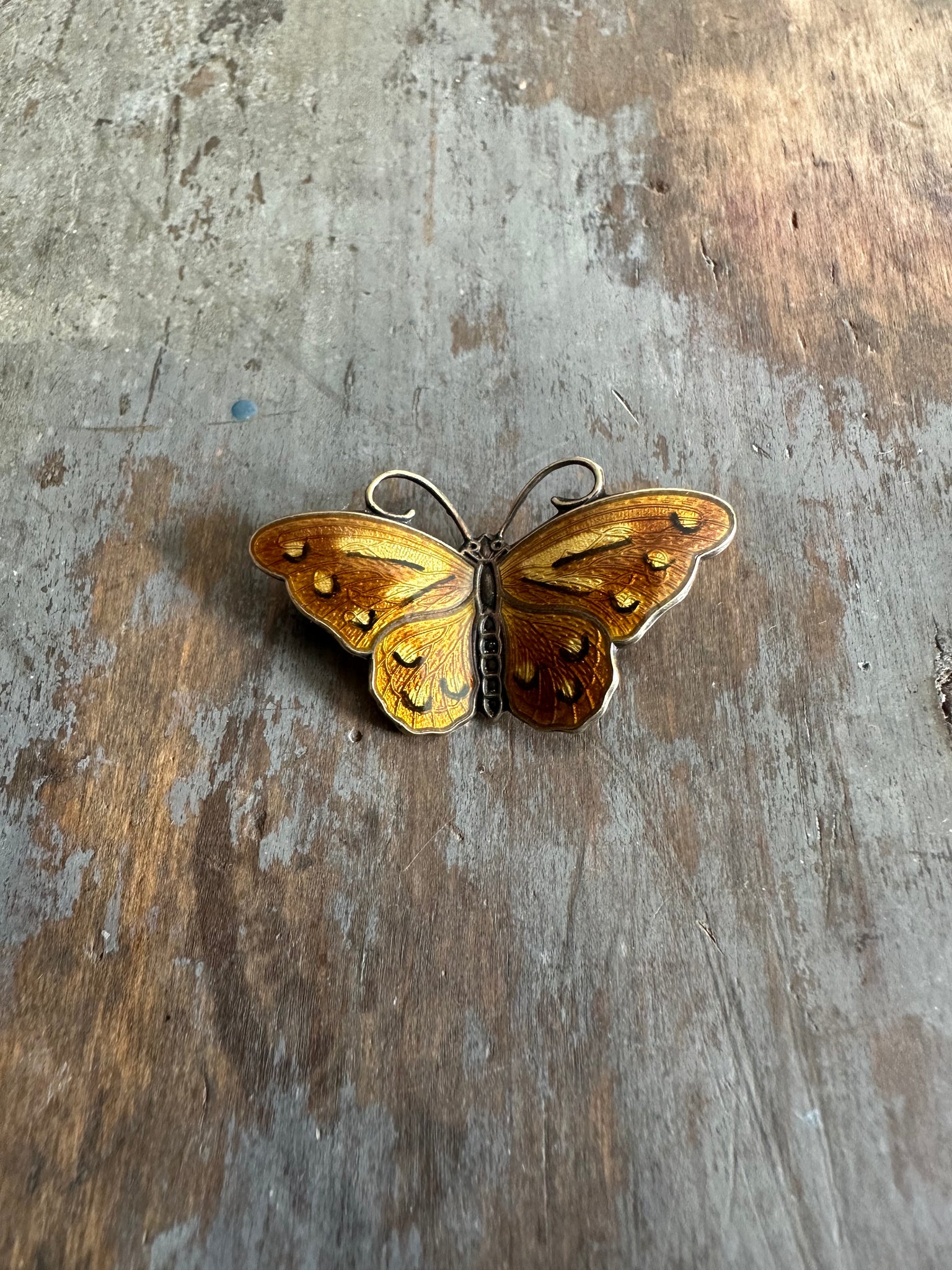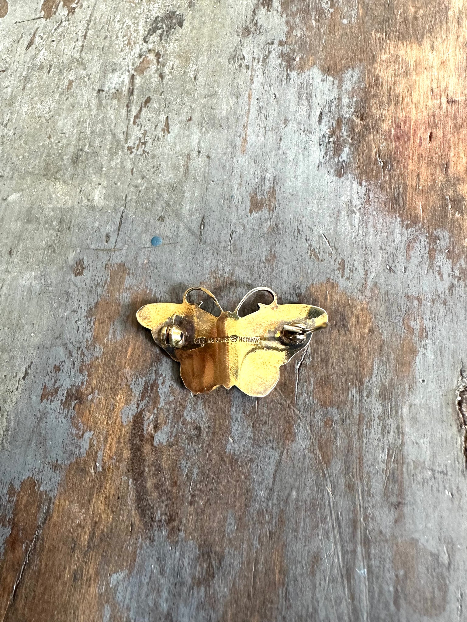 Lovely Sterling Silver enamel butterfly pin.Made in Norway by Hroar Prydz.This has incredible fine detail to the enamel.Pale yellow accents on a dreamy shade of brown.Sterling silver Vermeil.The gold wash cleaned up beautifully.This piece is hallmarked STERLING 925S with the Hroar Prydz round makers mark NORWAY.It measures just 1.5" long across the top of the wings by 7/8" wide or tall.