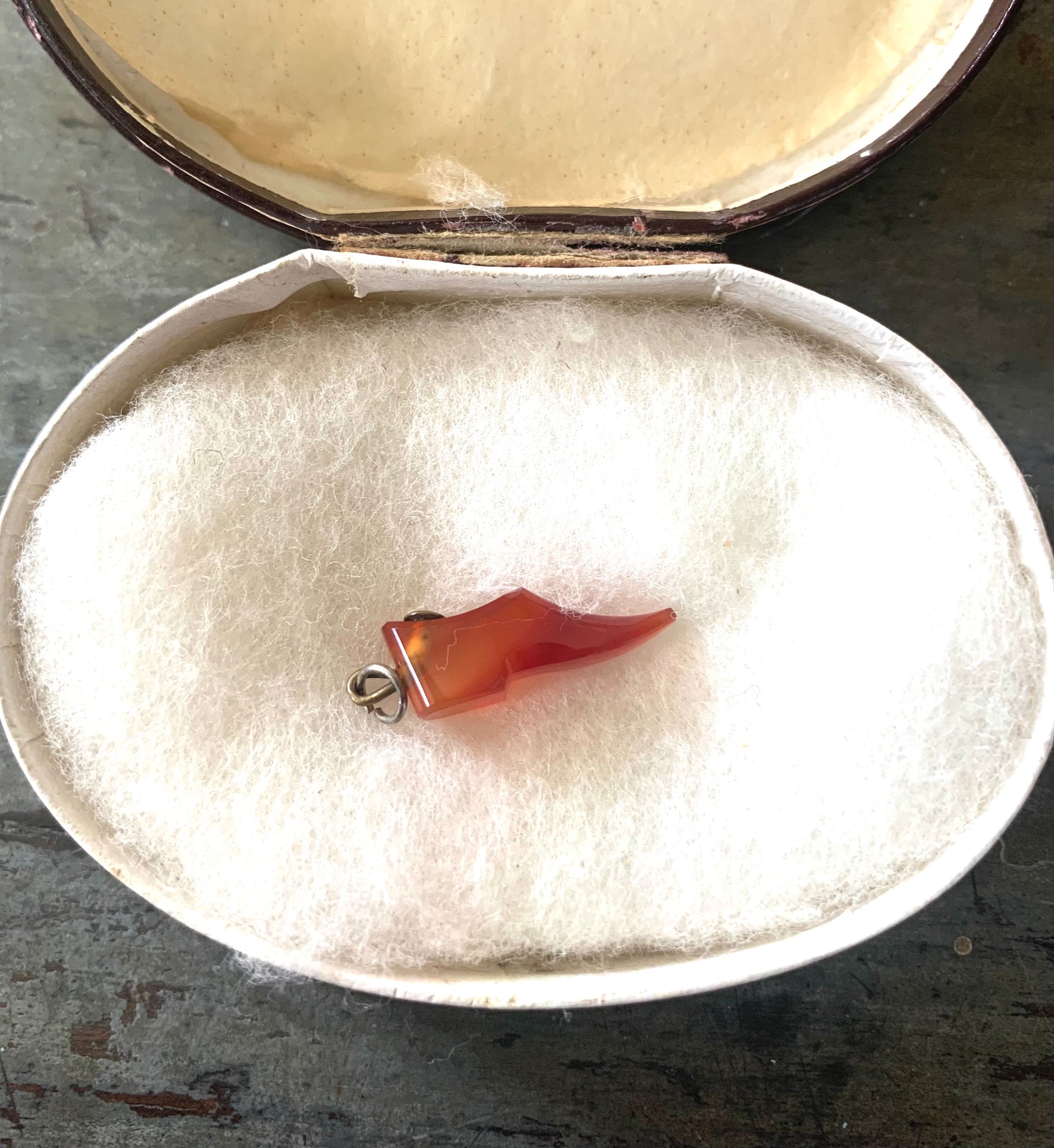 Happy to offer this rare charm. Victorian hand carved Carnelian shoe. It measures 1” overall. The shoe itself is 3/4” by 1/4”. You can see the variations in the Carnelian. There are no chips or cracks.
