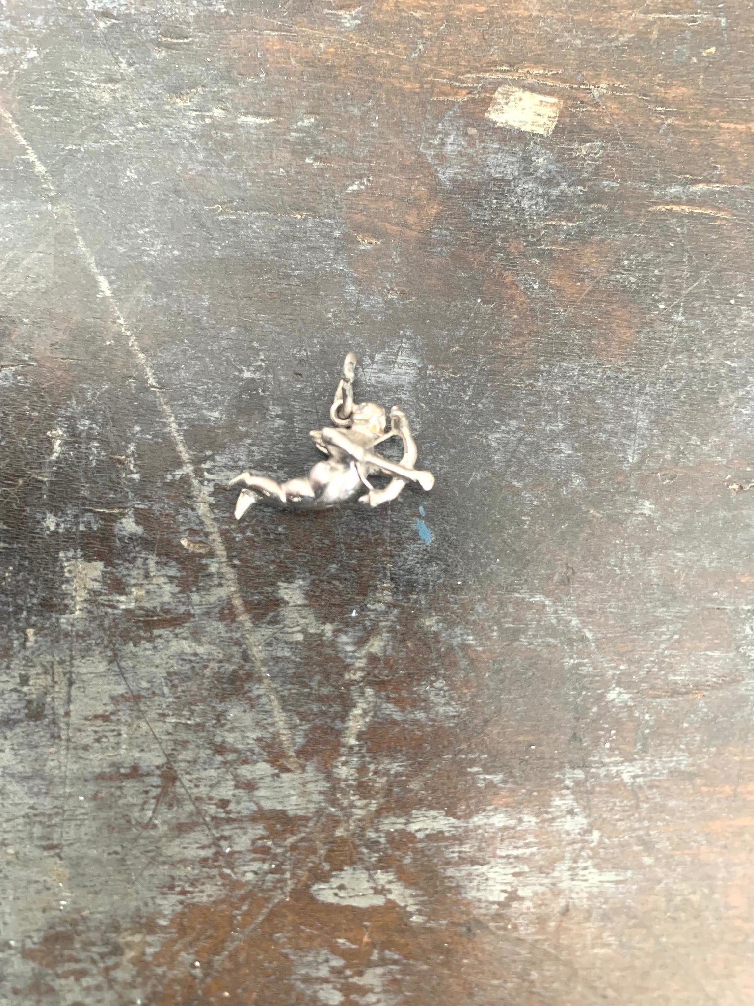 Sweet tiny Cherub Charm.This winged Cherub is in flight complete with his arrow. Made by Wells. And hallmarked as such with STERLING as well. He measures 3/4” by 3/8” . And hangs 1/2” with original jump ring. Last photo of all I am listing separately for size comparison.