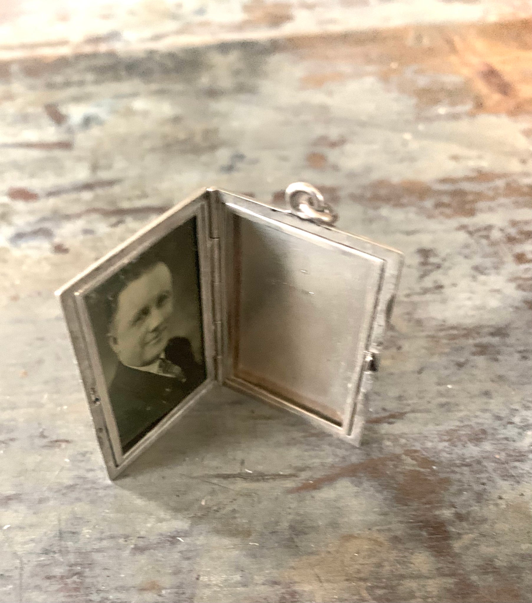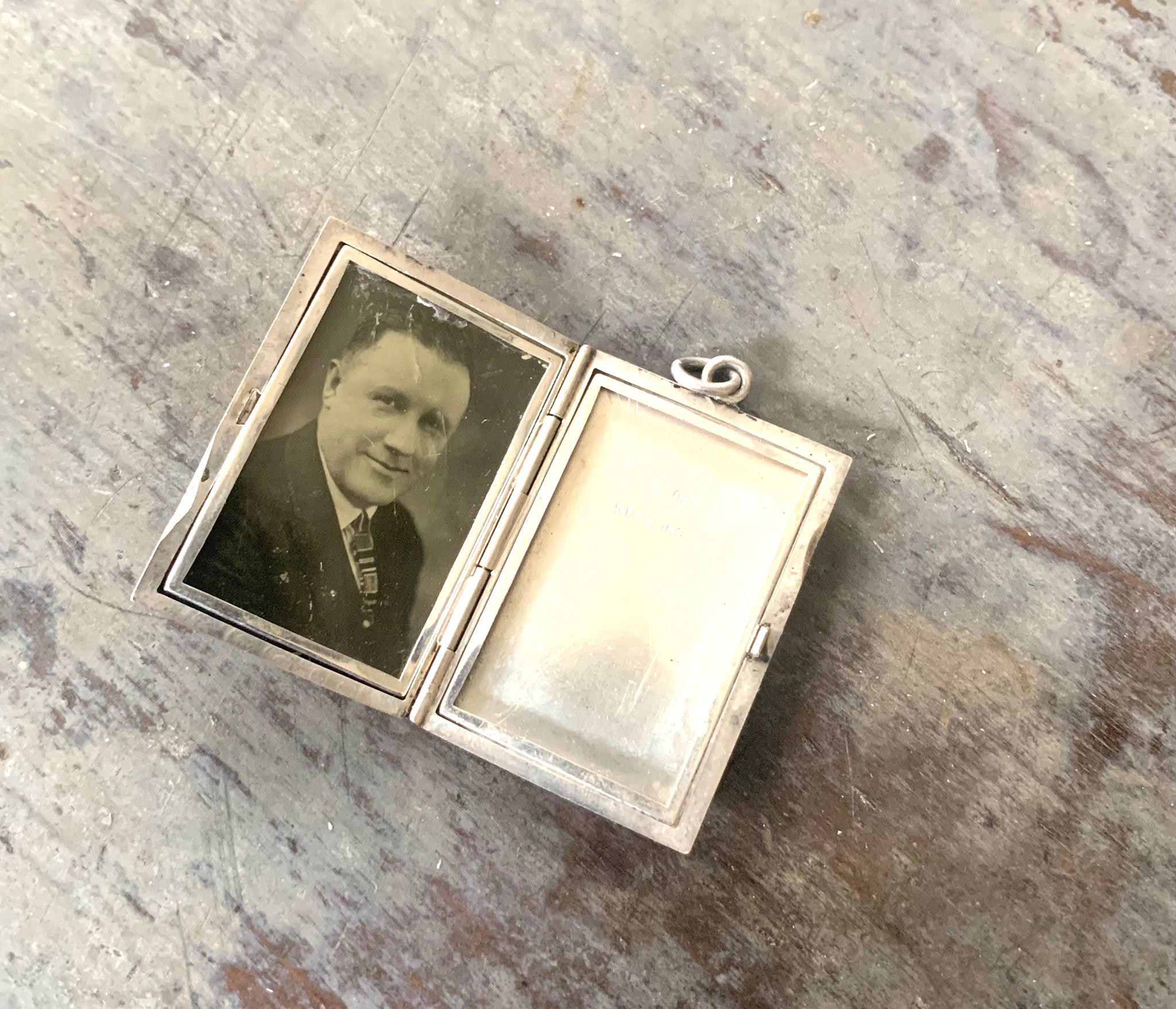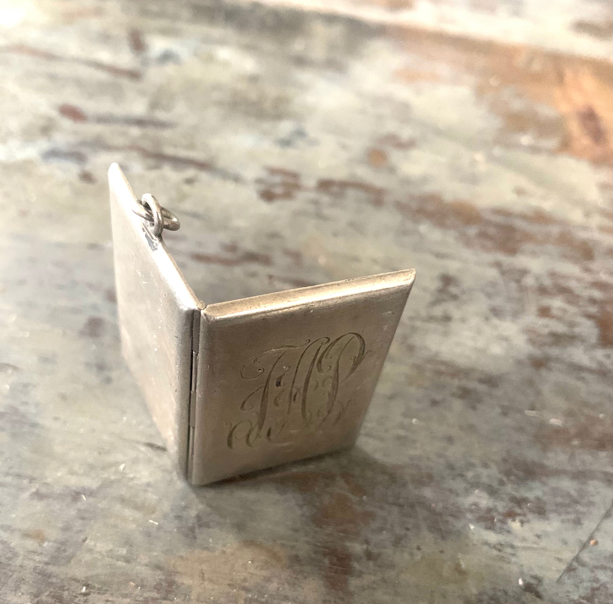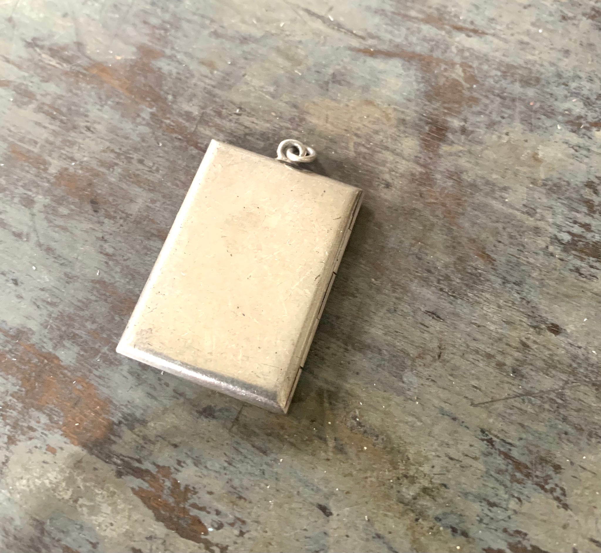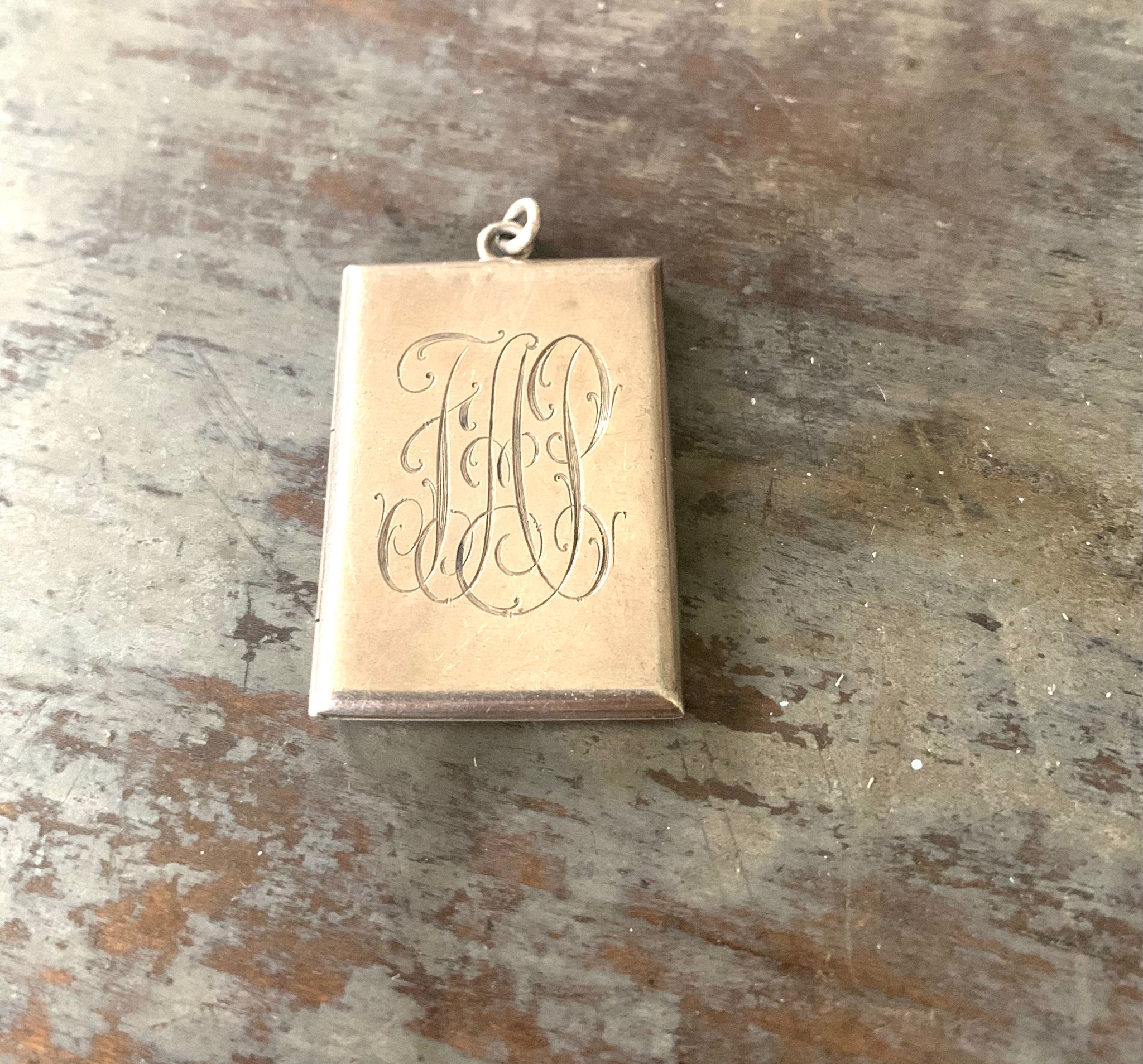 This is a beautiful larger rectangular Art Deco locket. It measures 1.5” by 1” . It will hang 1 3/4” with the original bail and ring.The fancy monogram is FAP. The locket retains both original photo frames.And one original photo. It has 2 slots for easy opening. It closes as it should be a click. It is hallmarked STERLING and a makers mark I cannot decipher. It weighs 10 grams.
