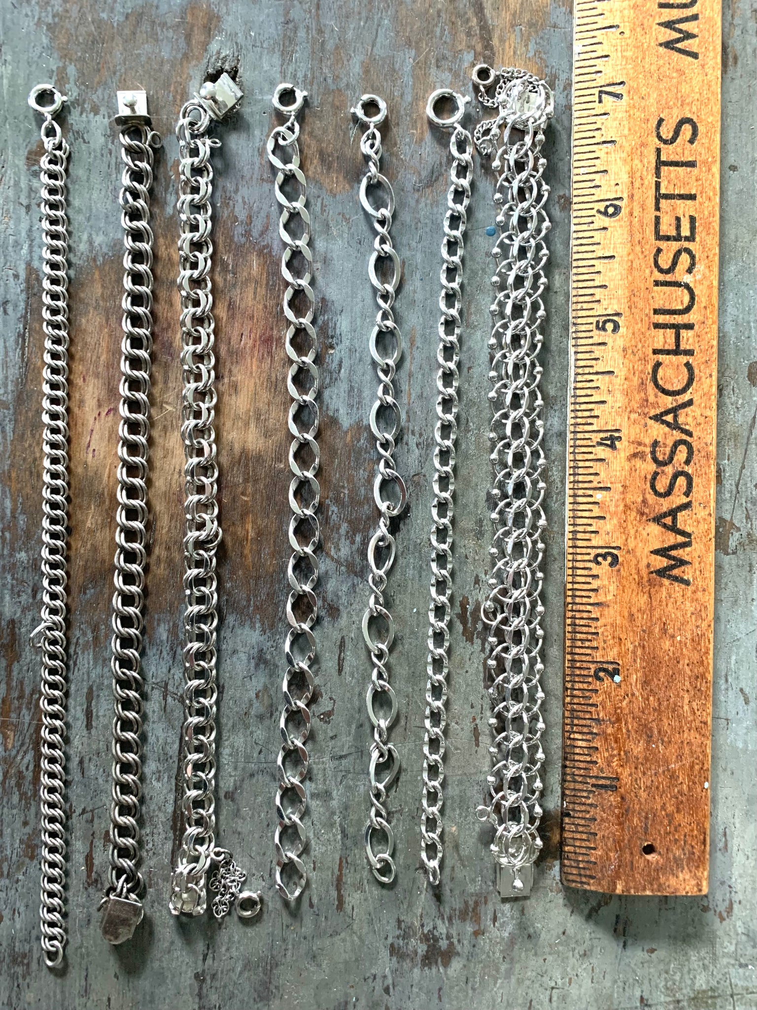This listing is for the first bracelet on the far left in the first photo. It is 8.25” long by 3/8” at the widest. Has coiled rope oval links interspersed with plain oval rings.