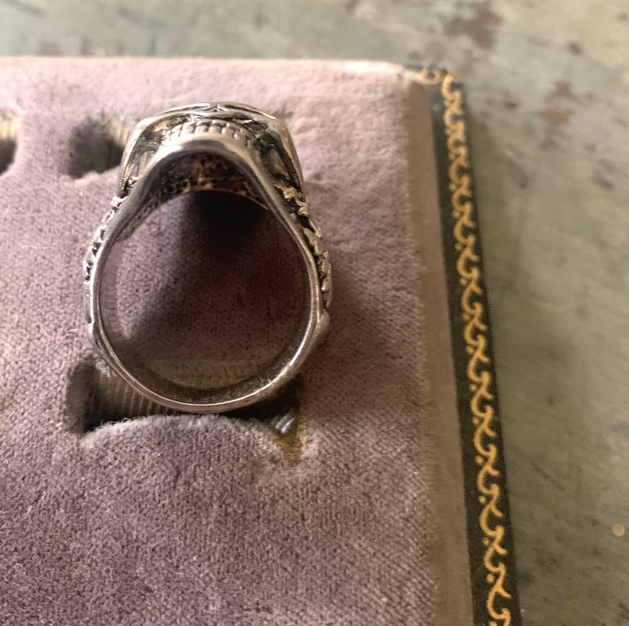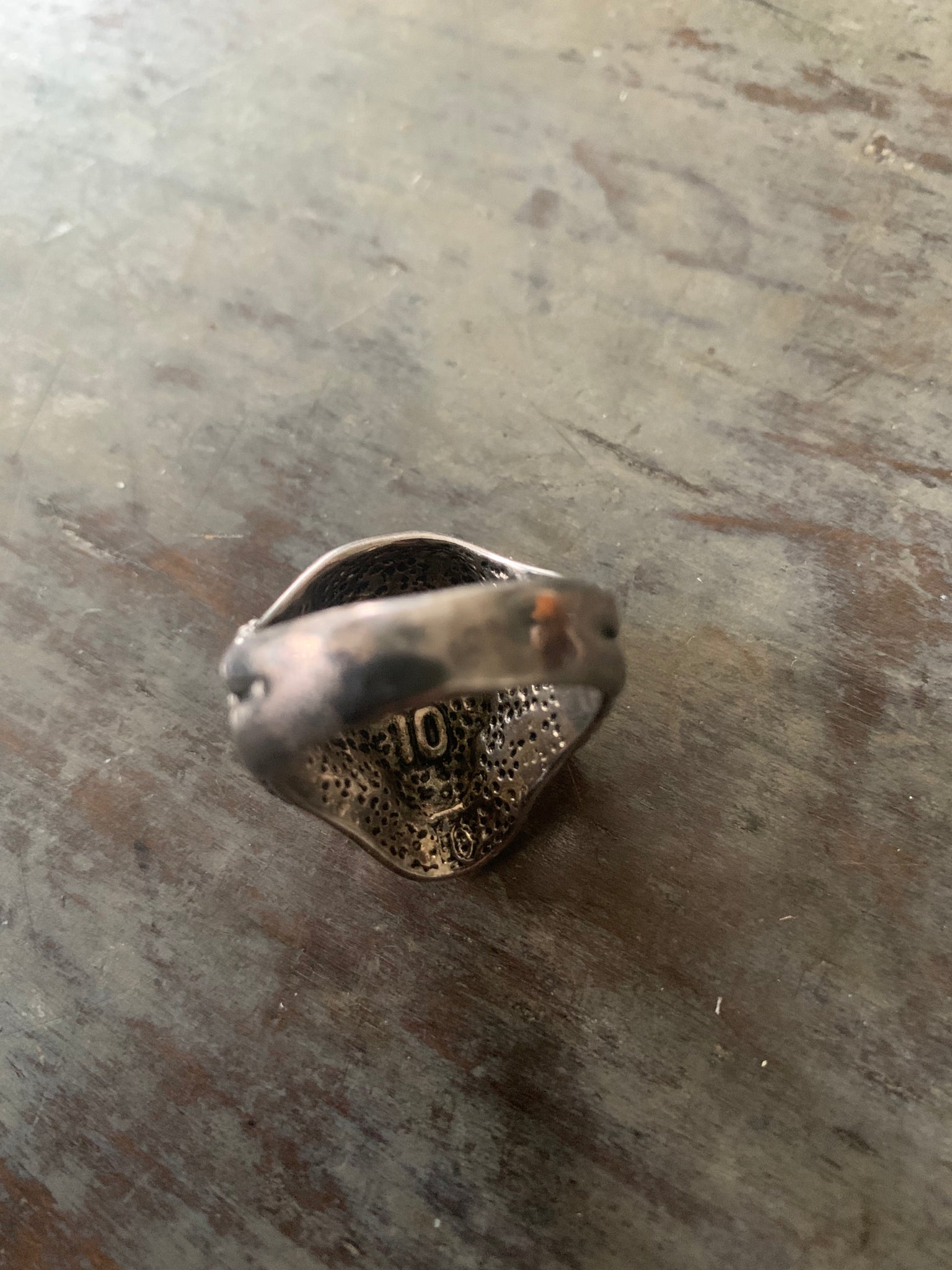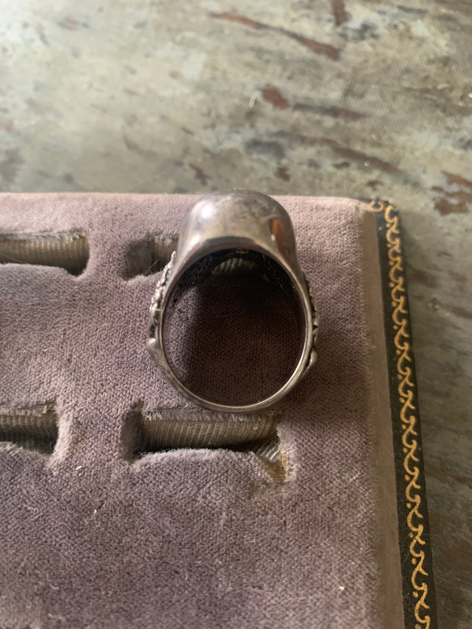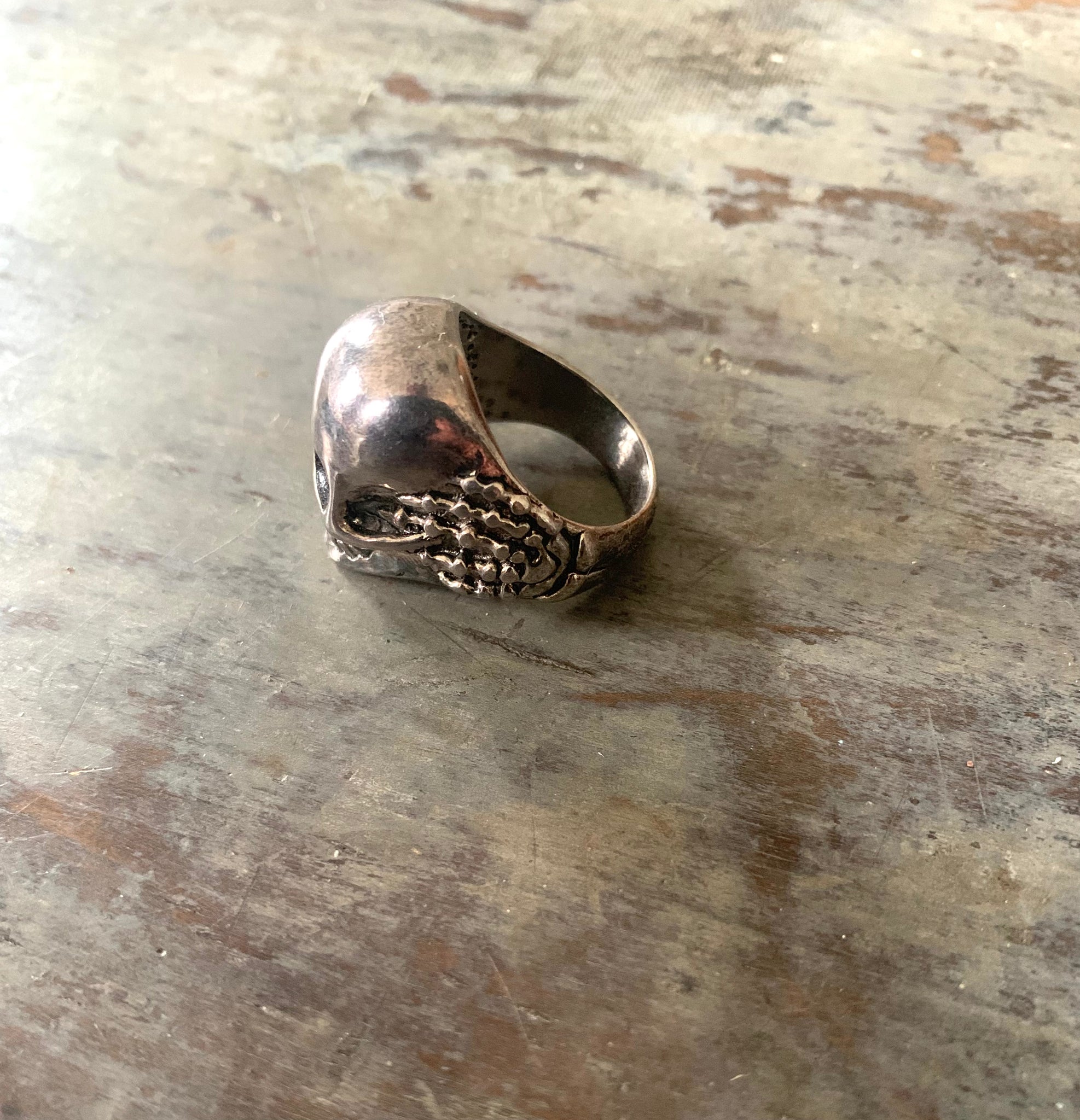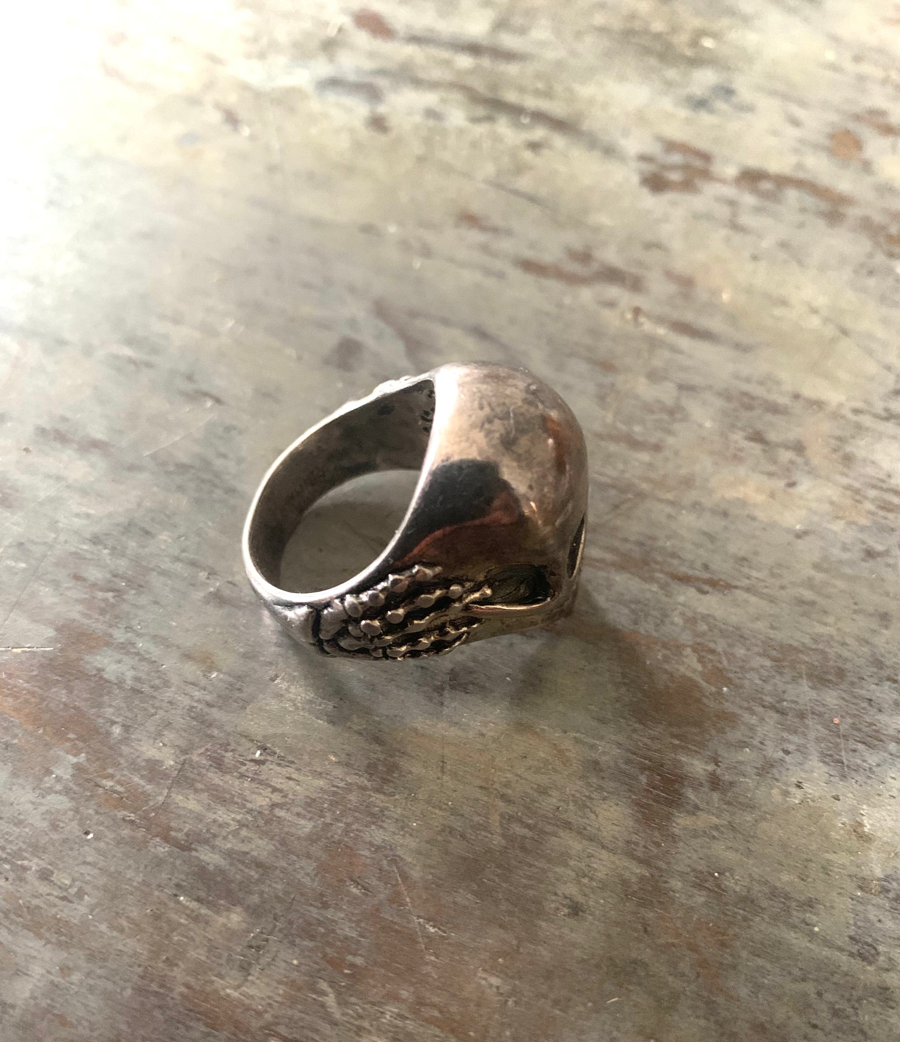 Another awesome Skull ring from the 80’s. This one has great detail as well. The shoulders are Skeleton Hands that wrap around to the Skull. Size 10. Hallmarked as such and also fits perfectly on the ring Mandel as a sz 10. It weighs 15.9 grams. Very solid as well. Signed, hallmarked 10 G &S ‘86 with the copyright. Very well made