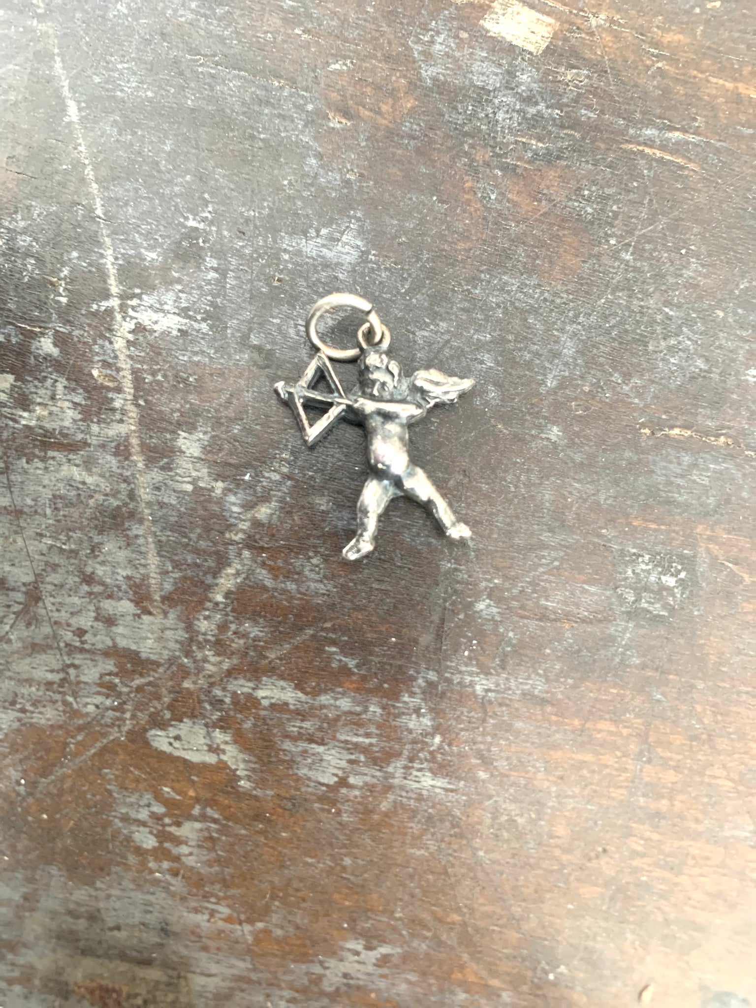 Another sweet Cherub Charm complete with Cupids Arrow. This guy is standing drawing back his bow. He measures 3/4” by 5/8”. Last photo shows all that I am listing separately for size comparison.