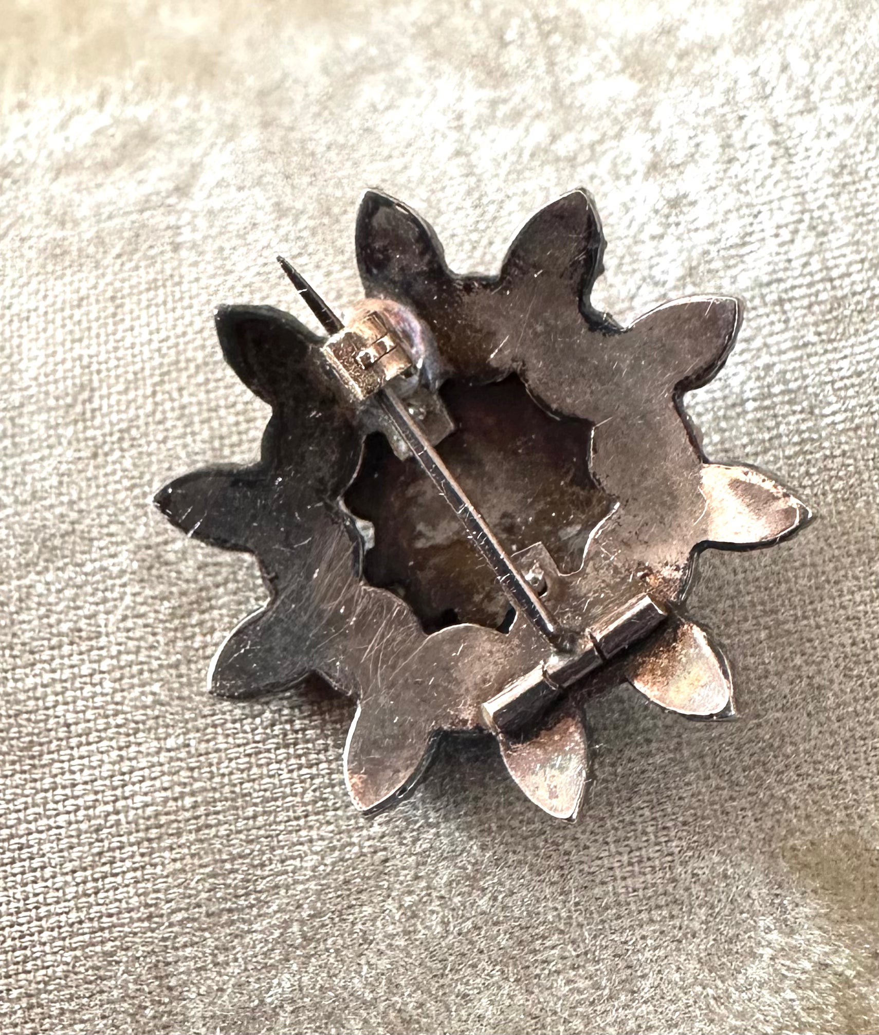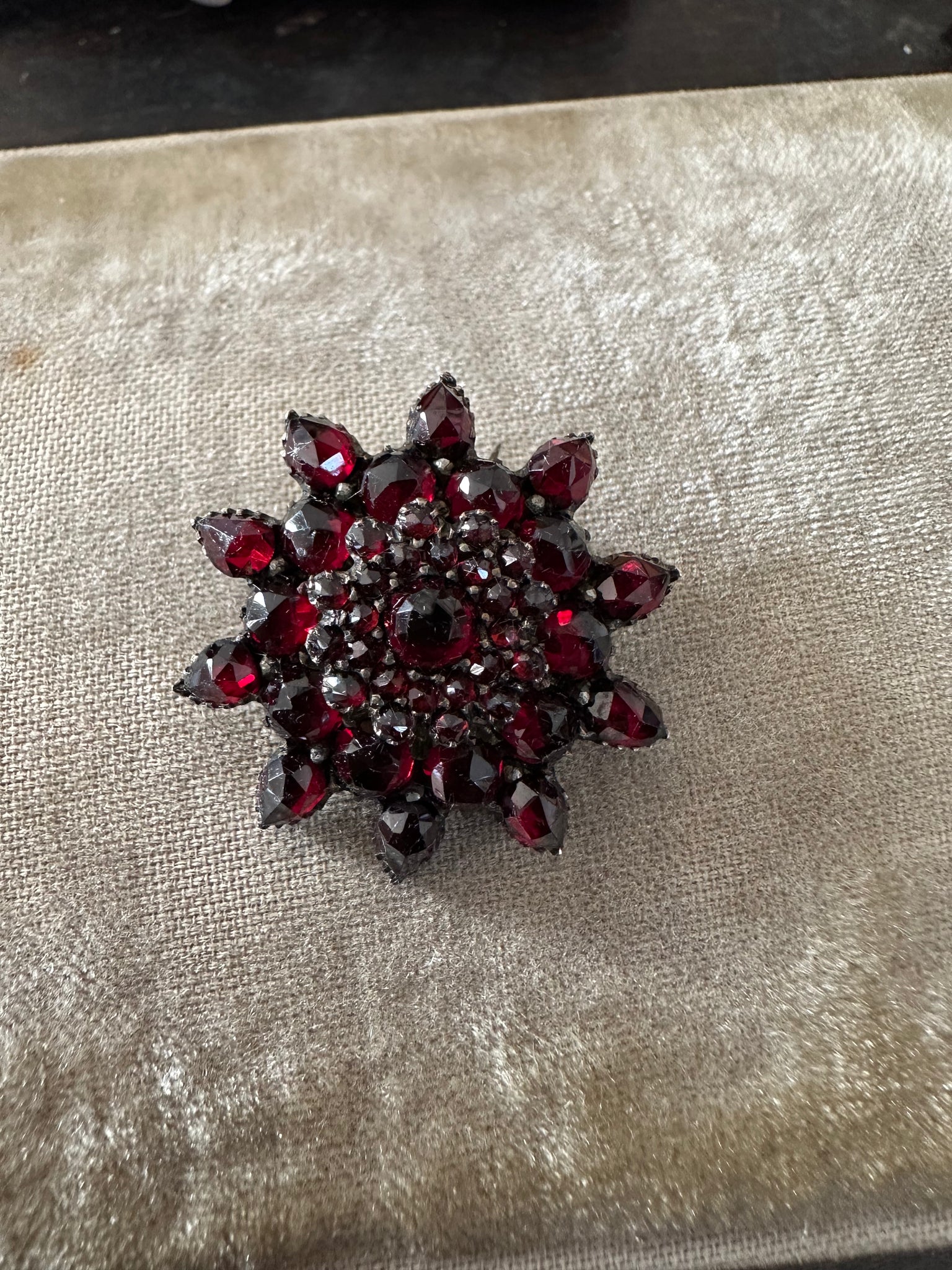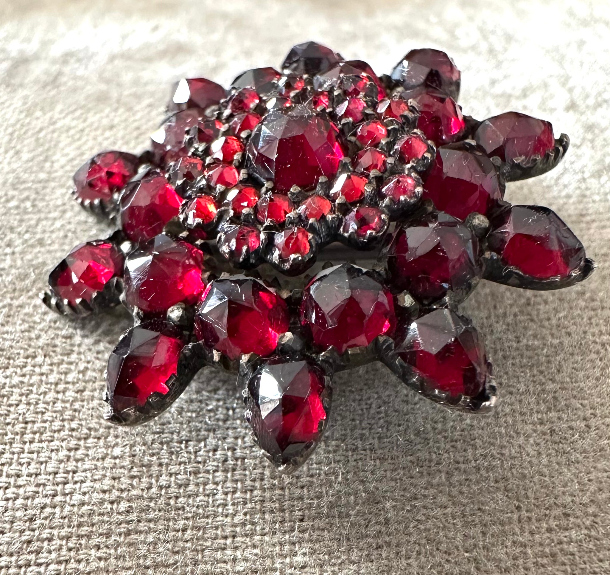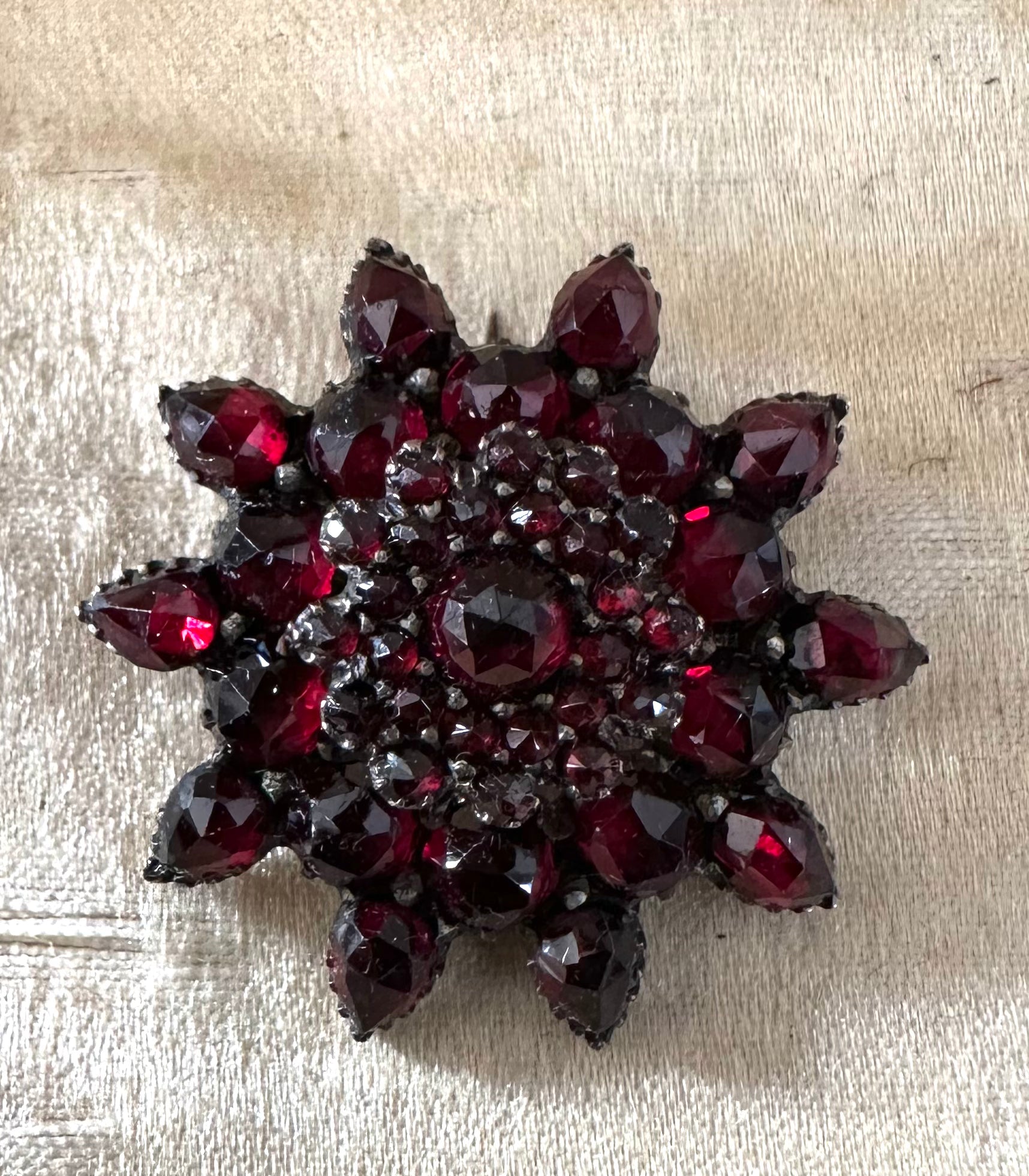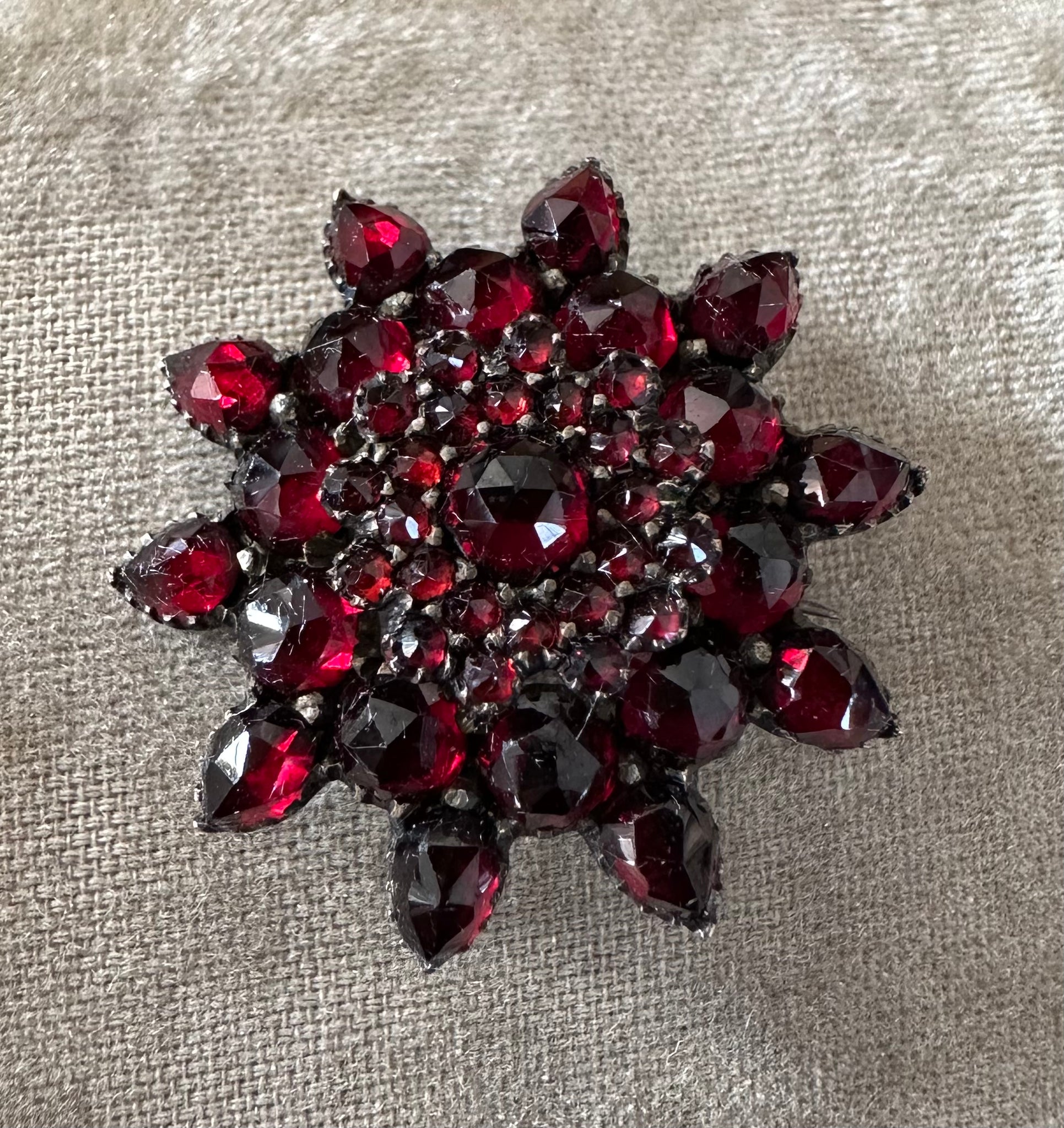 Another beautiful Bohemian Garnet pin from the Victorian era. These bright, juicy faceted garnets sparkle in the light. This design GN is a stacked flower. At least 4 sizes and shapes of gorgeous garnets. This measures 1 1/8” in diameter. So not big . Set in silver with a light gold wash. The clasp has been replaced at some point. The hinge and pin are original. The clasp is locking now and appears to be gold or gold plated. It worked perfectly.