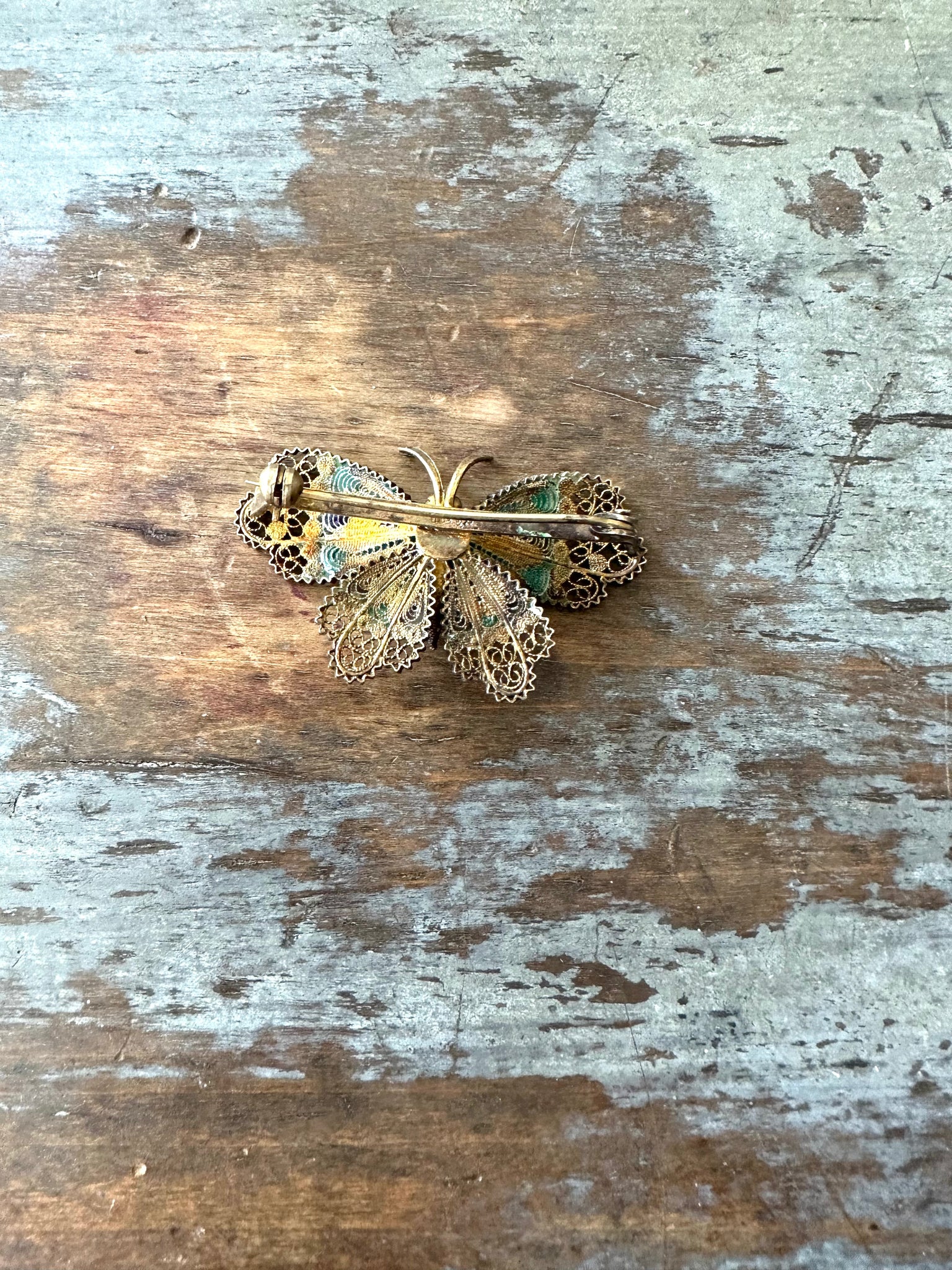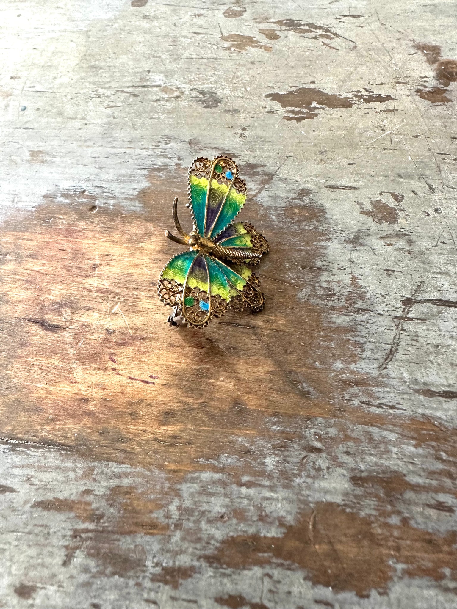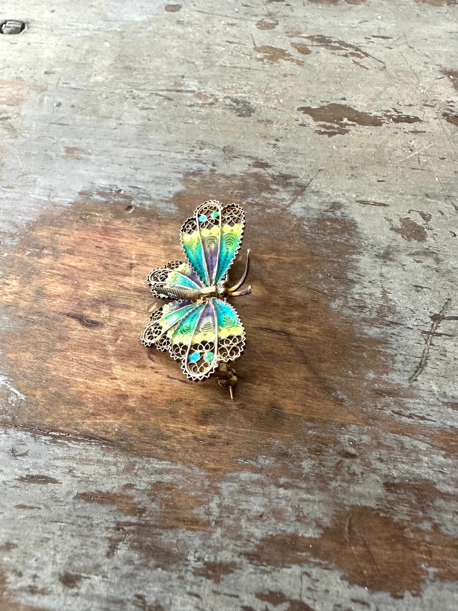 This is a lovely vintage 800 Silver Vermeil and Enamel Butterfly pin or brooch. This one has beautiful teal, chartreuse and a hint of purple on it wings . 🦋 It is in great condition with no damage to the enamel or filigree. The little body has coiled rope wire too making it a little more special. It measures 1 3/4” long across the wing span by 1” wide . It is hallmarked 800.