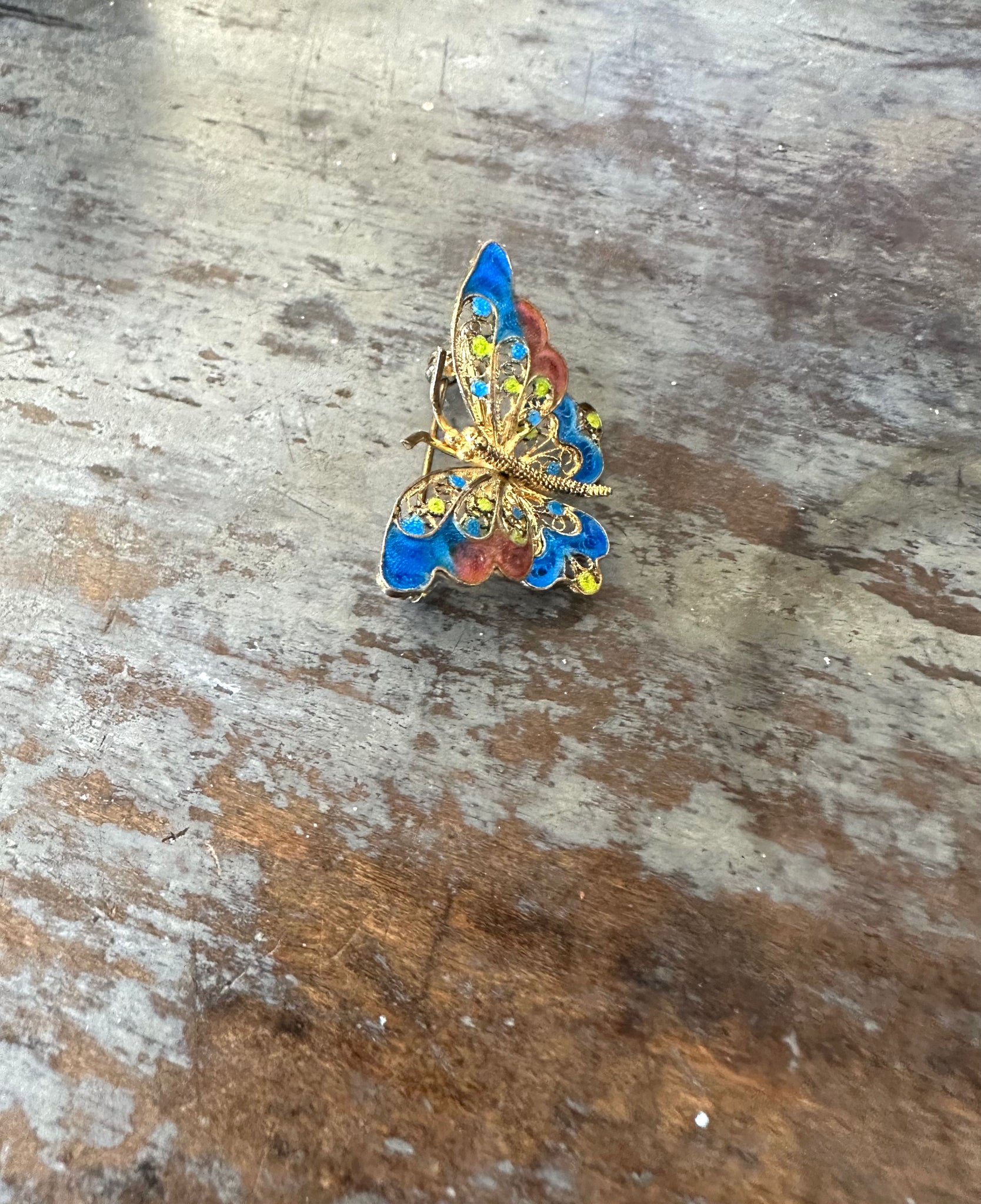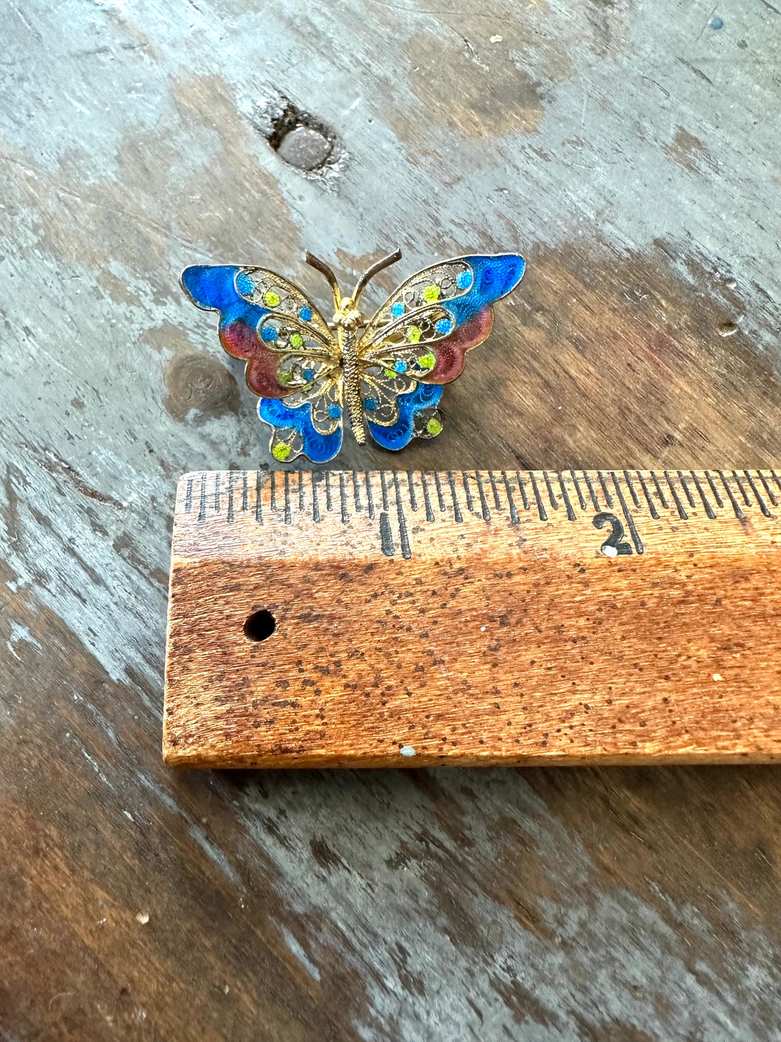 Sweet 800 Silver Vermeil filigree Butterfly Pin. This one has cobalt blue, chartreuse and a pink mauve enamel. All set on a gold wash silver filigree.which is in excellent shape and the enamel stands out. The little body has a coiled rope as well. Amazing little works of art these insects are! It measures 1 5/8” long across the top of the wingspan and is 1” .