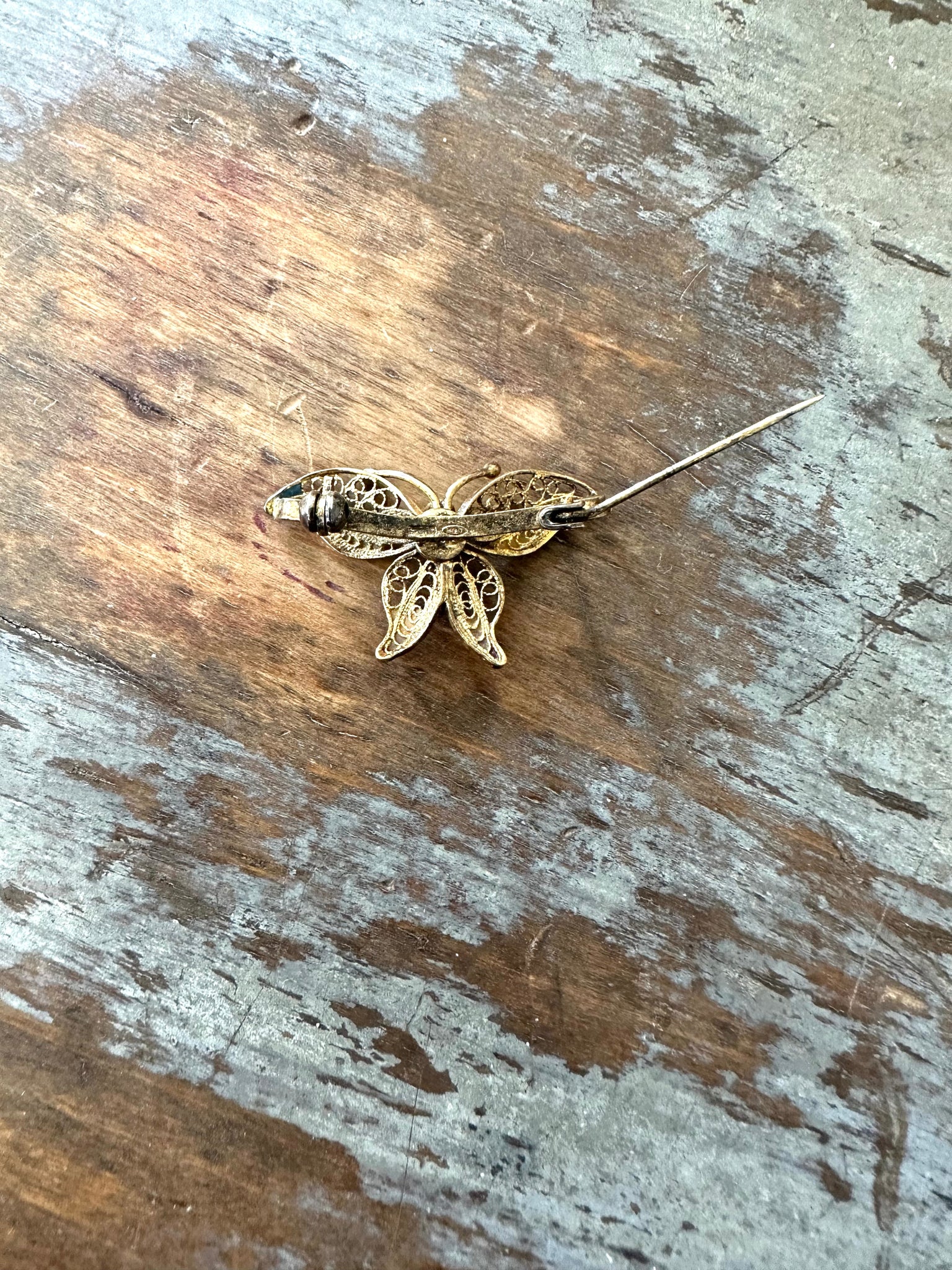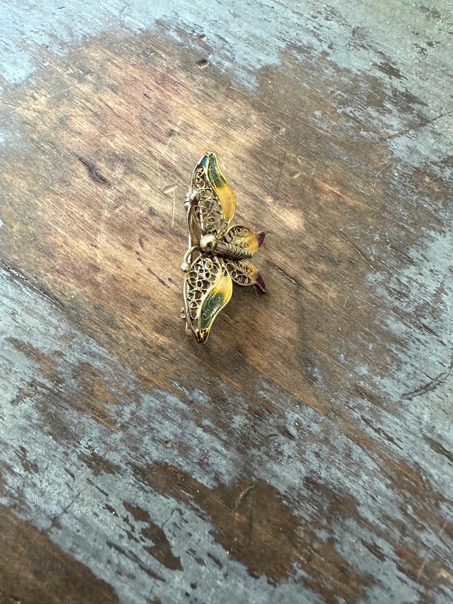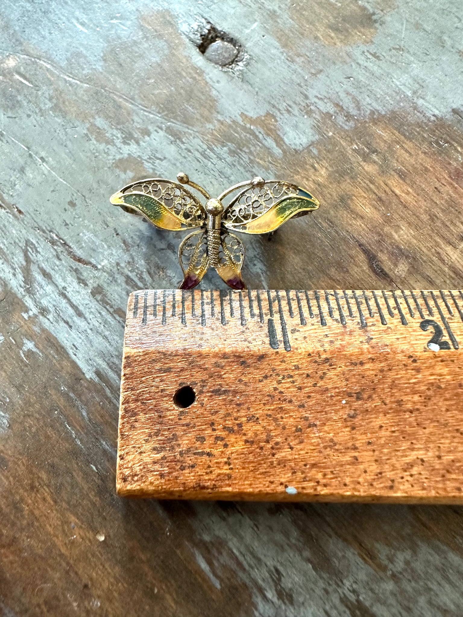 This sweet butterfly pin is also 800 Silver Vermeil Filigree with yellow and green enamel and purple lower wing tips. The tiny body is also coiled wire wrapped for extra detail. The bead head and antennae are also lovely details! Also hallmarked 800 and with a makers mark. This little guy measures 1 3/8” across the top of the wings by 3/4”.