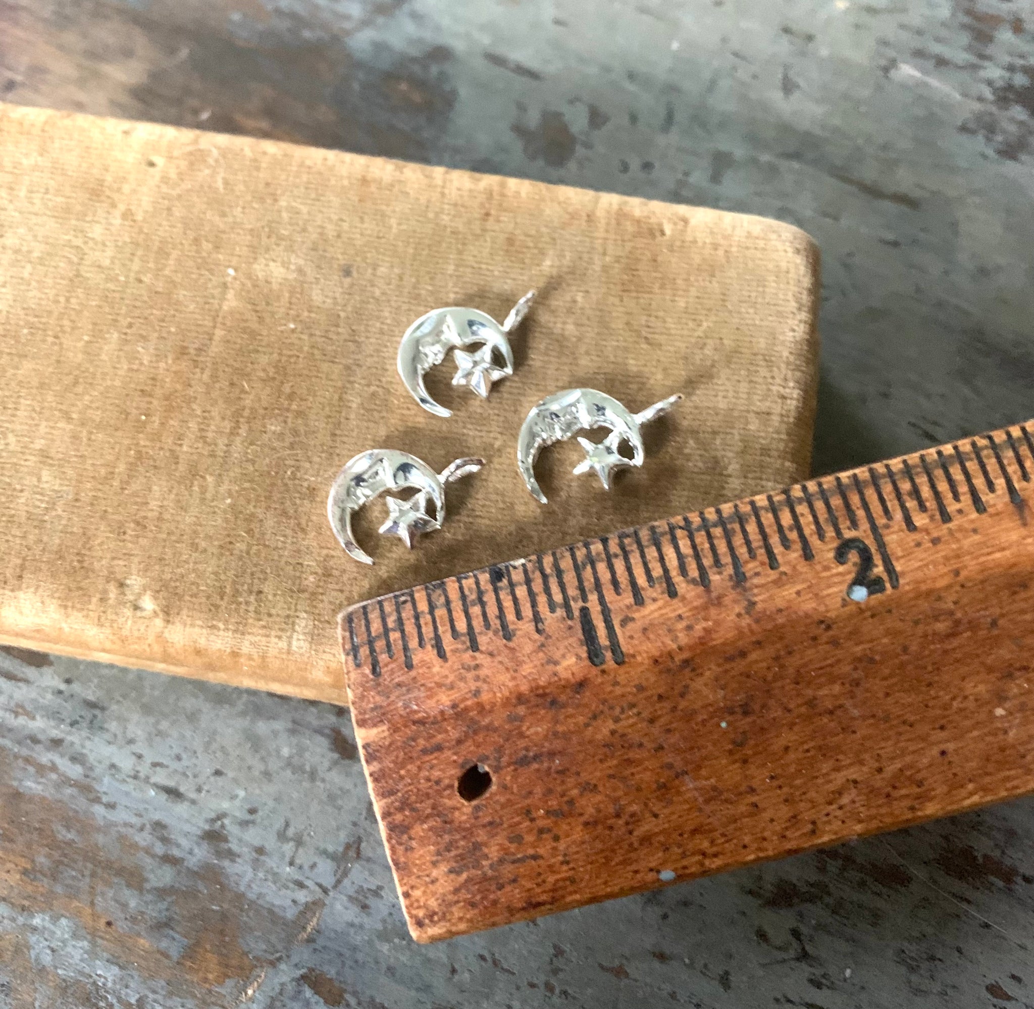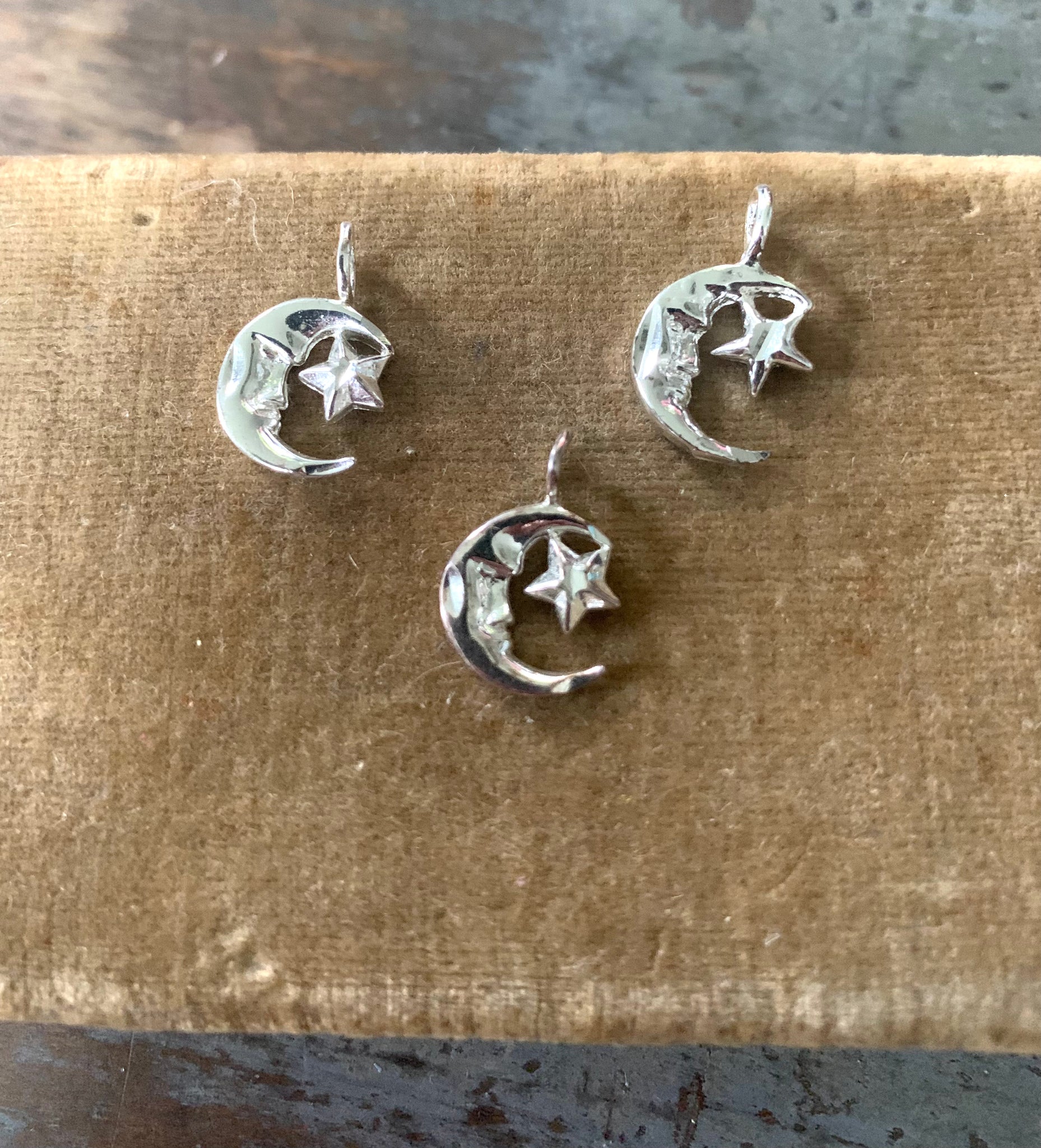 Vintage NOS Sterling silver Crescent moon star charms. Approximately 5/8” with the attached bails. All hallmarked 925 and makers marks I cannot decipher.