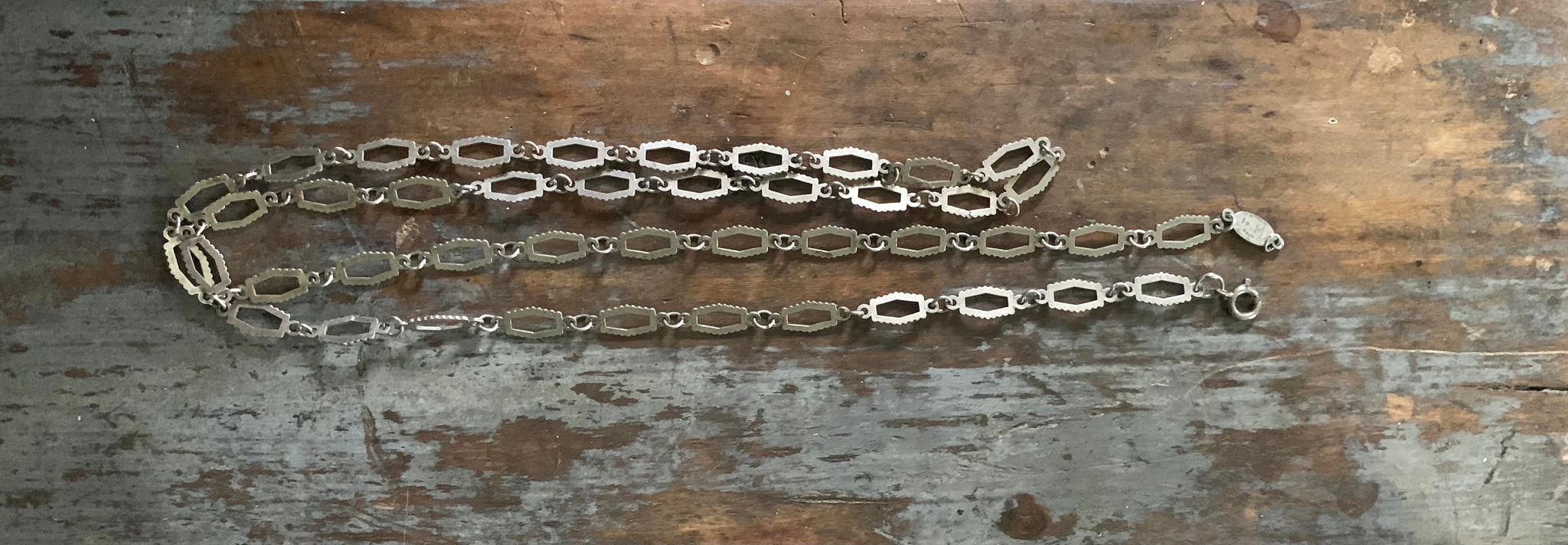 This is a 32” vintage textured edge oblong link chain necklace. Hallmarked HECHO EN MEXICO STERLING 925 with a Crown mark over an O. The links are 1/2”-5/8".