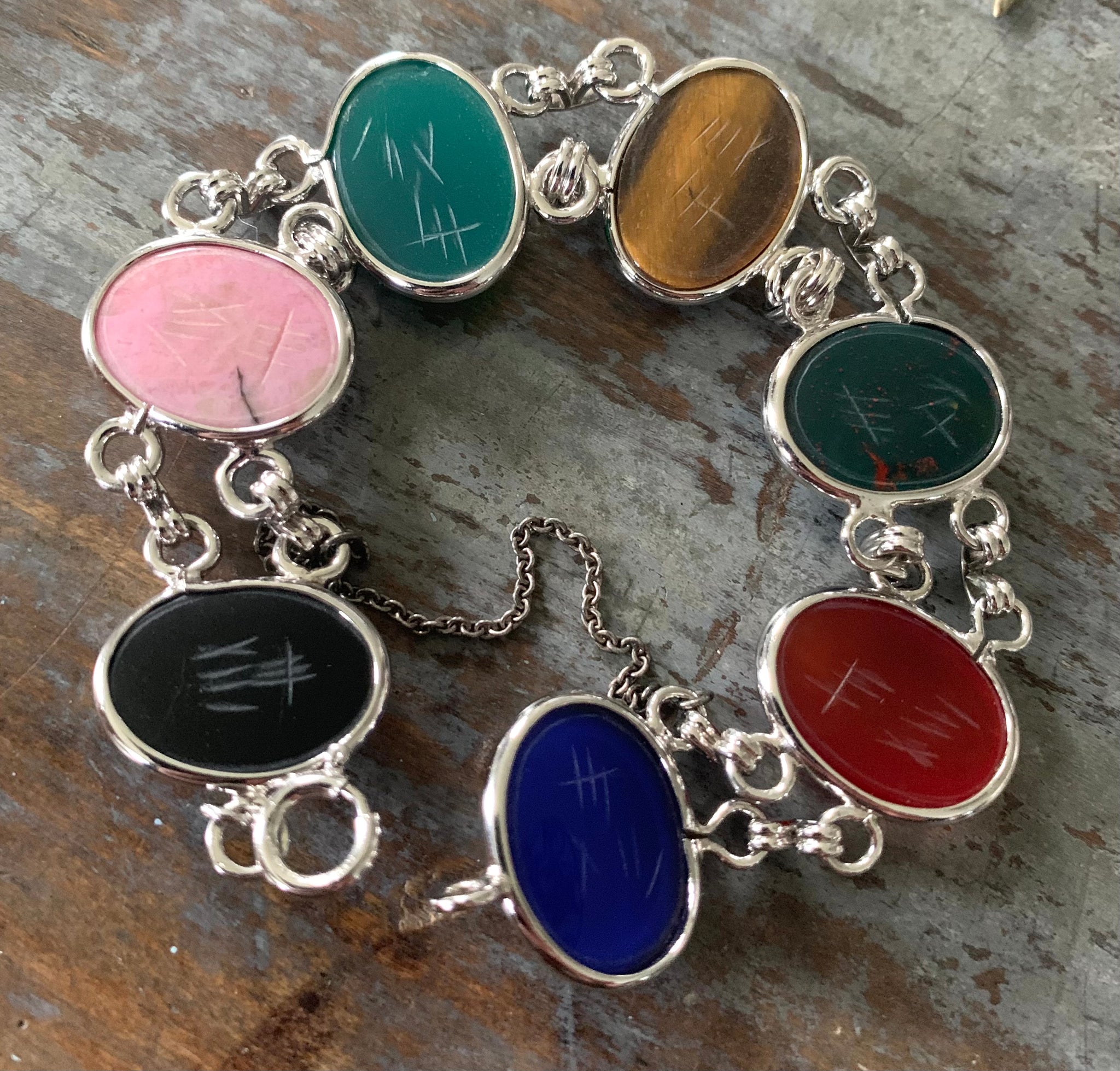 This is a double link larger or chunkier bracelet. It measures 7.5” overall. It is 3/4” wide. The bracelet features 7 semi precious stones of Blue,Green,Chalcedony , Onyx,Bloodstone, Carnelian, Tigers Eye and pink Kyanite. I have removed the Safety chain as it did not have a clasp. And in this case it is not needed.someone had just added it